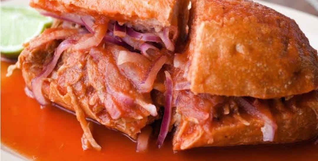 pan relleno de cochinita pibil acompañado de cebollita morada con un toque de habanero