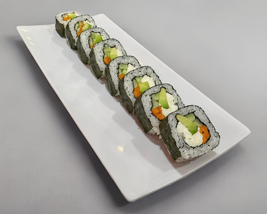 Lleva camarón, algas, pepino, zanahoria, queso crema y aguacate.