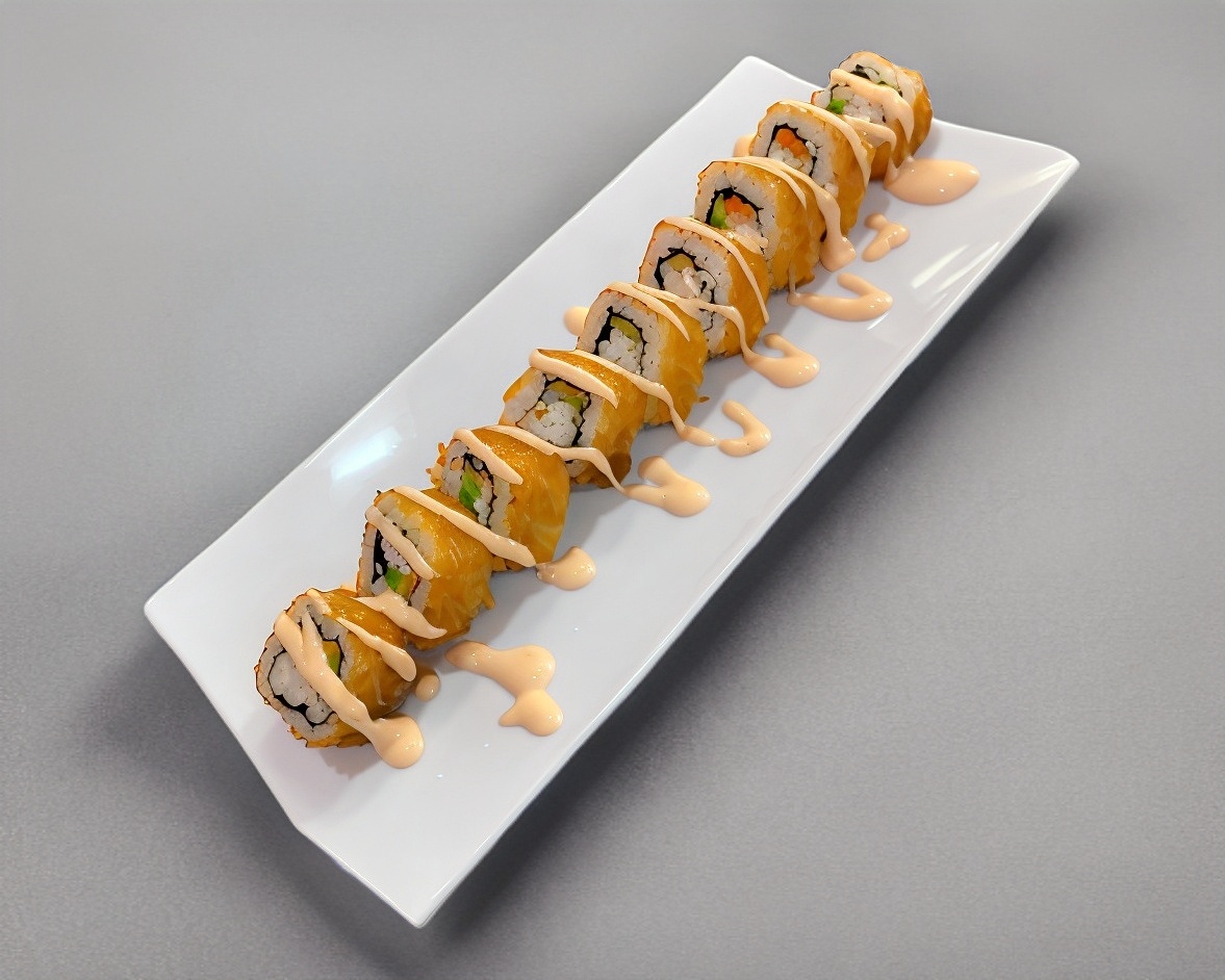Lleva salmón, queso, surimi, zanahoria, pepino, salsa sriracha, mayonesa y ajonjolí.