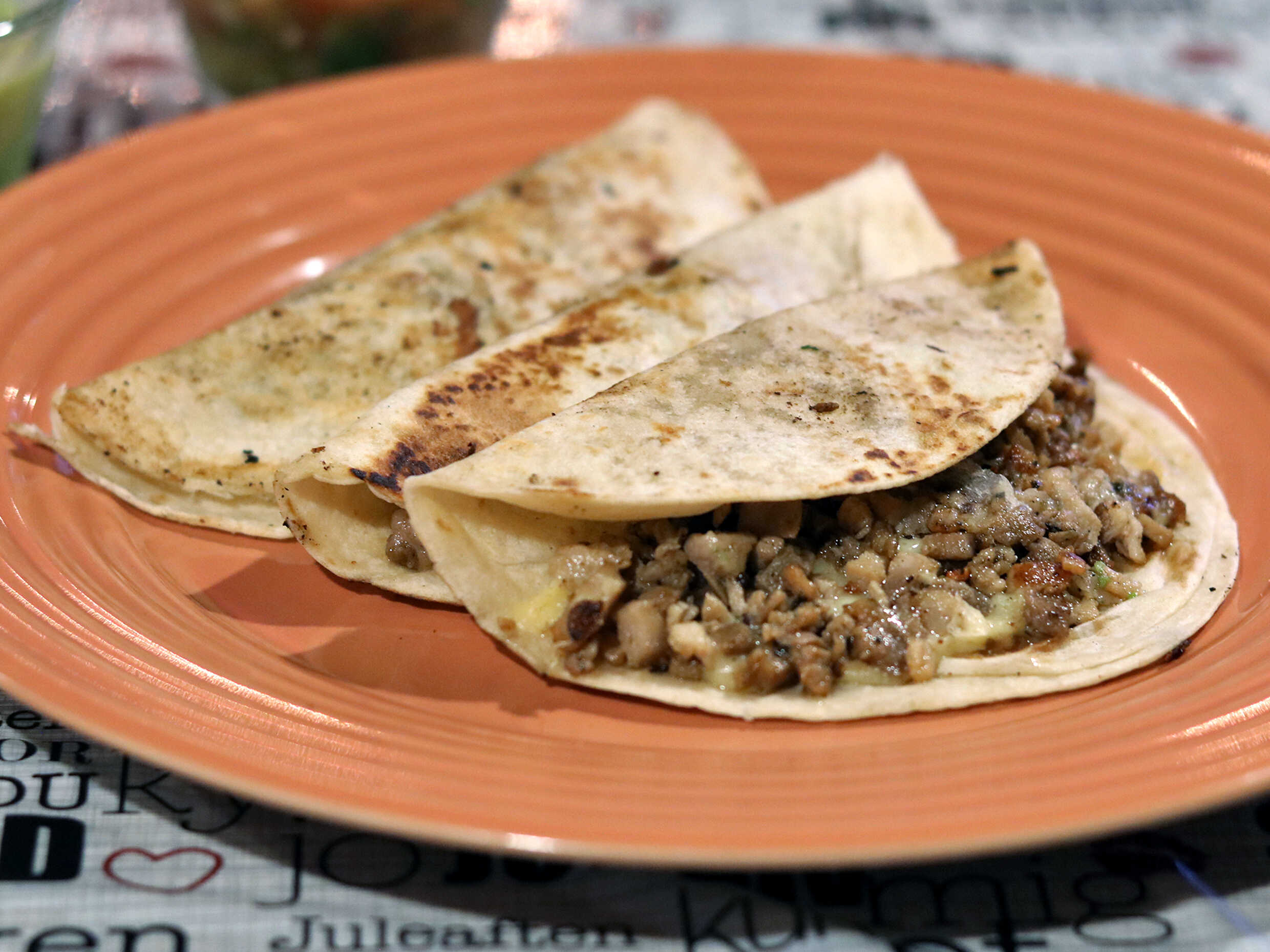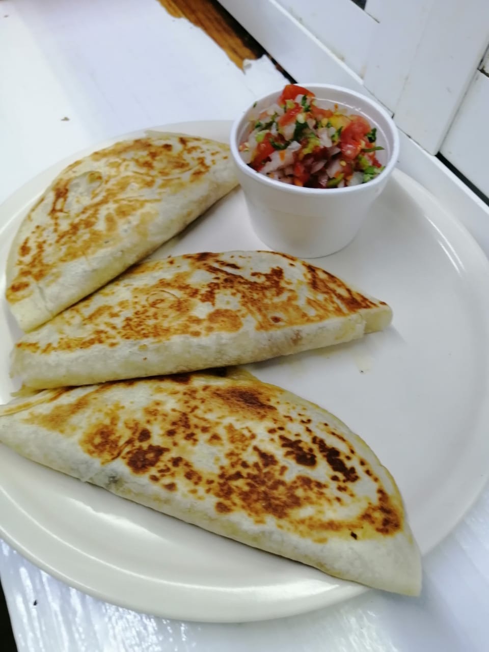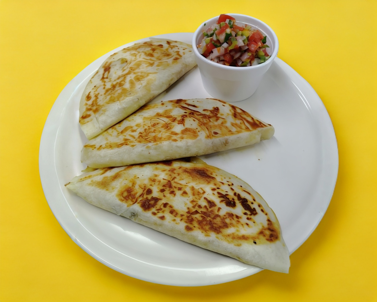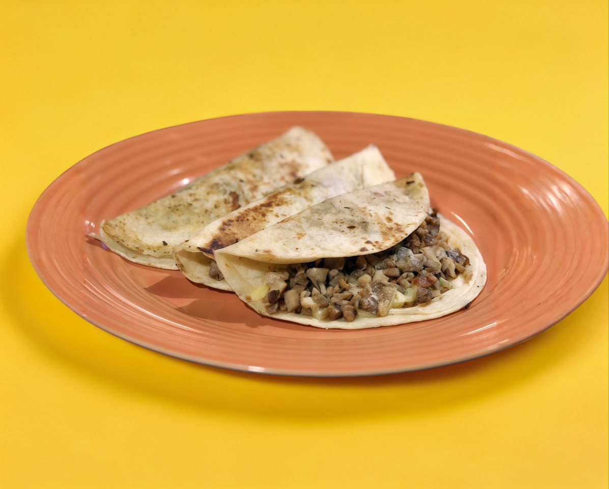 Deliciosa carne a tu elección (pastor o asada) gratinada con queso Oaxaca en medio de 2 tortillas de harina a la plancha.