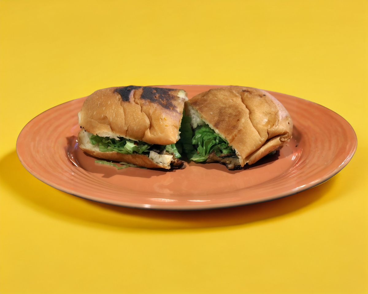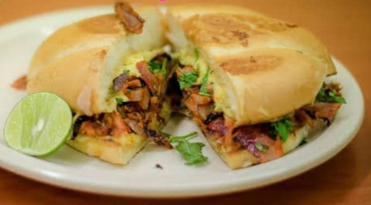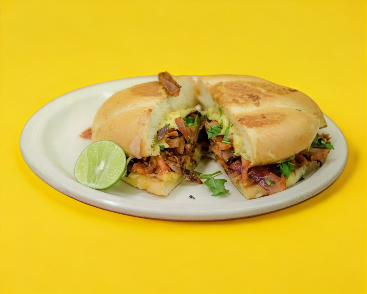 Deliciosa, hecha con pan, mayonesa, queso manchego, carne al pastor, lechuga, rebanadas de tomate y aguacate. (Porción personal)