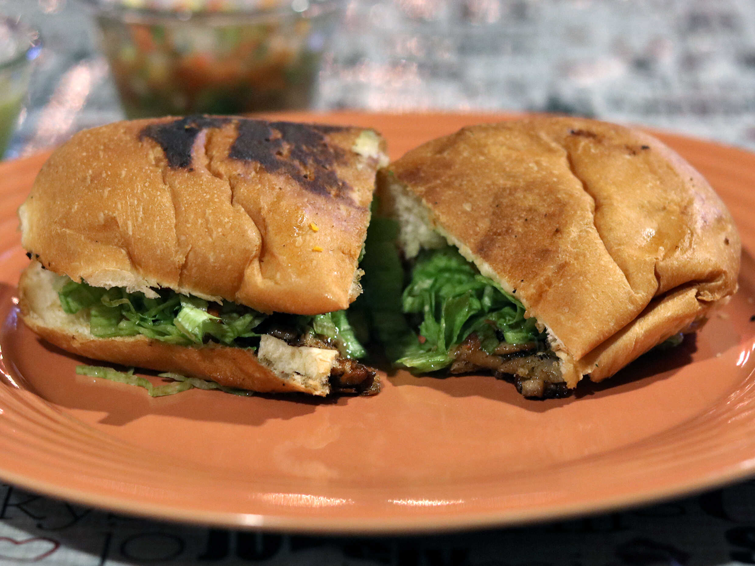 Preparada a base de carne típica de Chinameca, pan, mayonesa, queso mozzarella, lechuga, rebanadas de tomate y aguacate.