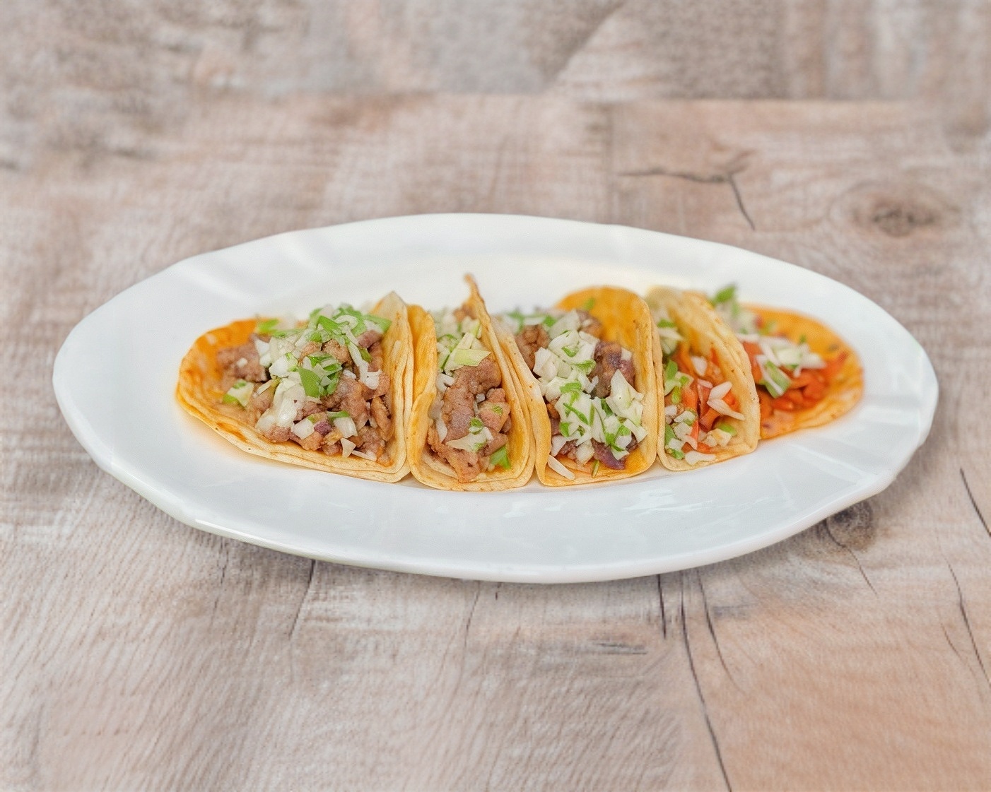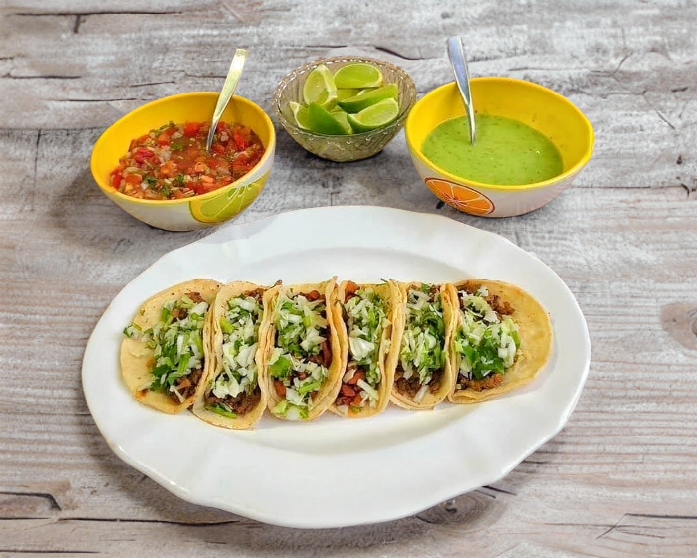 2 tacos de bistec + 2 tacos de tripa + 2 tacos de pastor + 2 tacos de longaniza