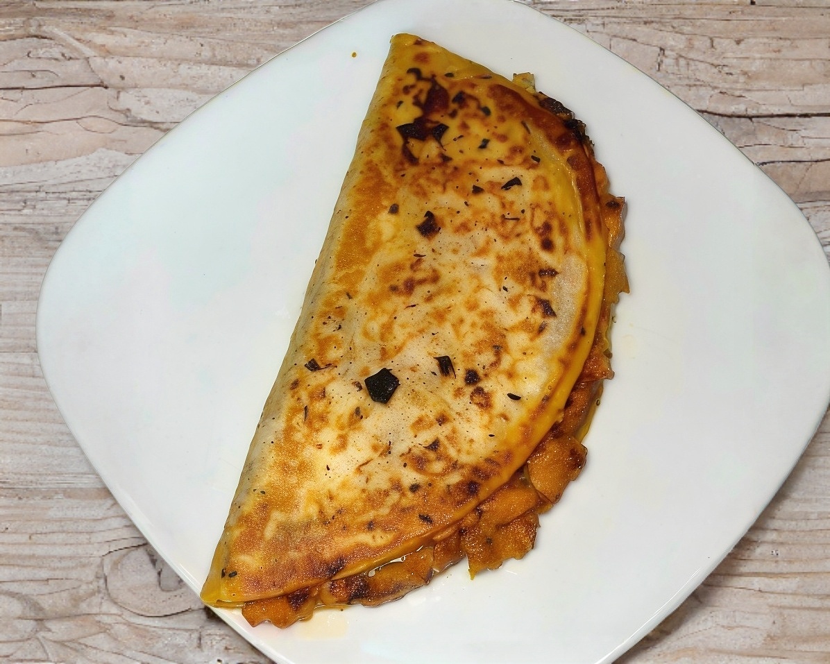 Tortilla de harina, carne de cerdo condimentada con un poco de cebolla cocida, queso manchego y condimento para el sabor