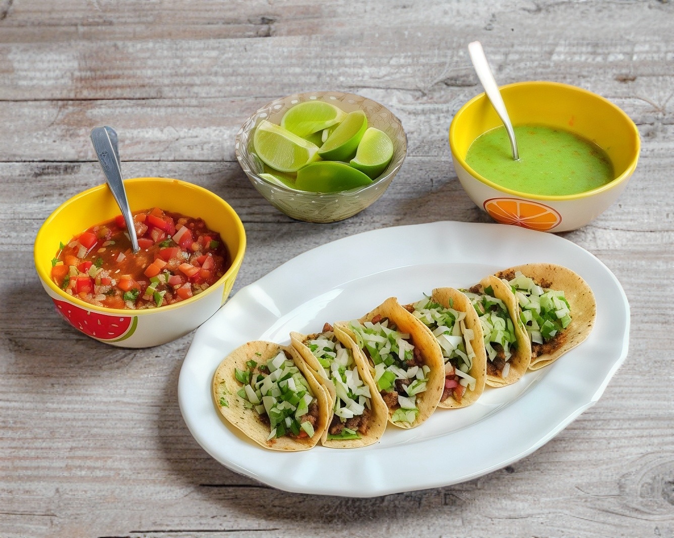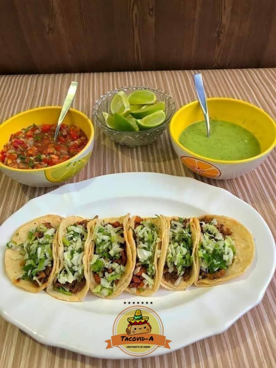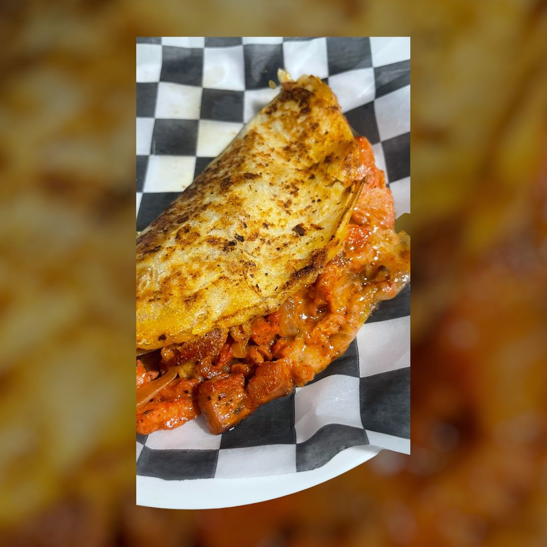 Tortilla de harina, carne de cerdo condimentada, queso manchego y condimento para el sabor