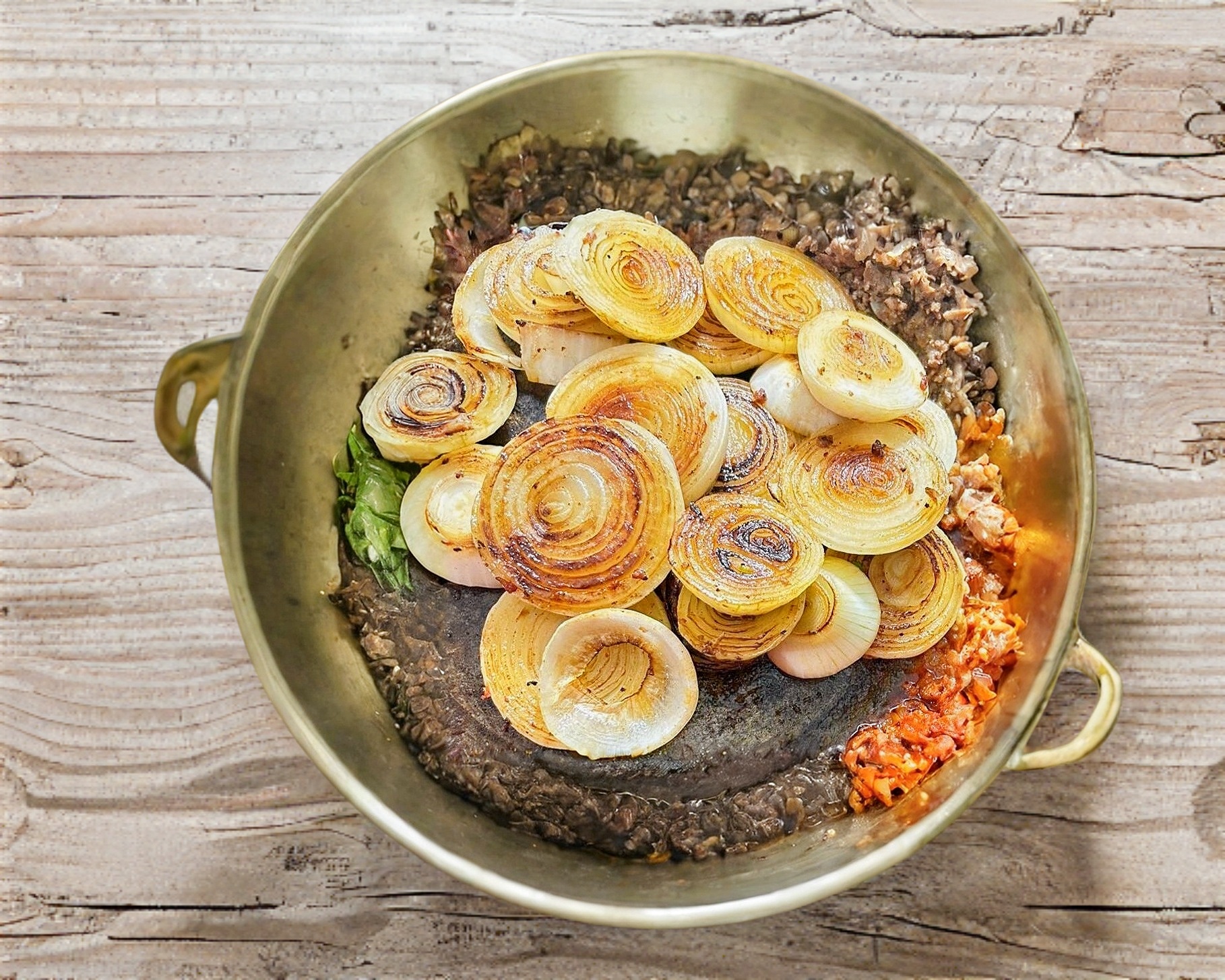 Taco de tortilla de maíz, tripa de res picada con cebolla cocida