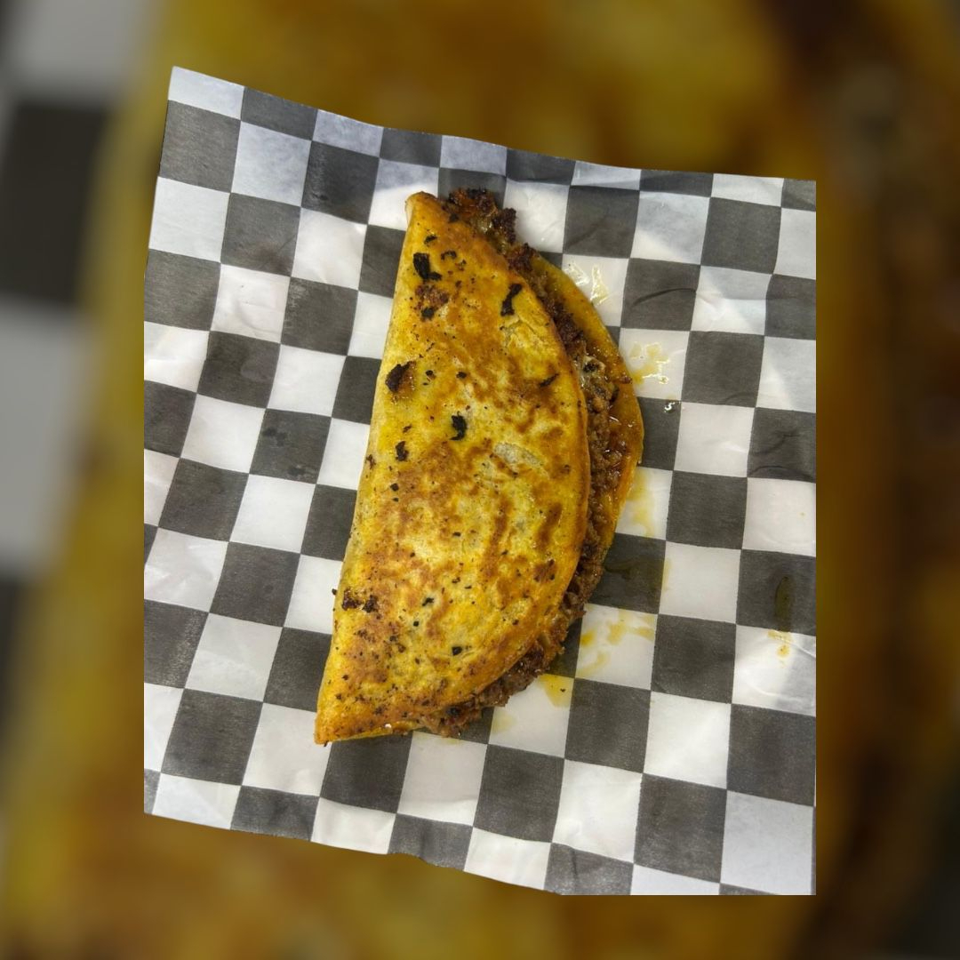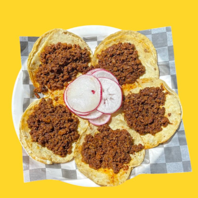 Taco de tortilla de maíz, carne de res picada con cebolla cocida, revuelta con queso manchego