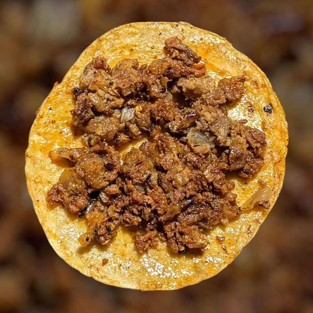 Taco de tortilla de maíz, carne de res picada con cebolla cocida revuelta con longaniza casera