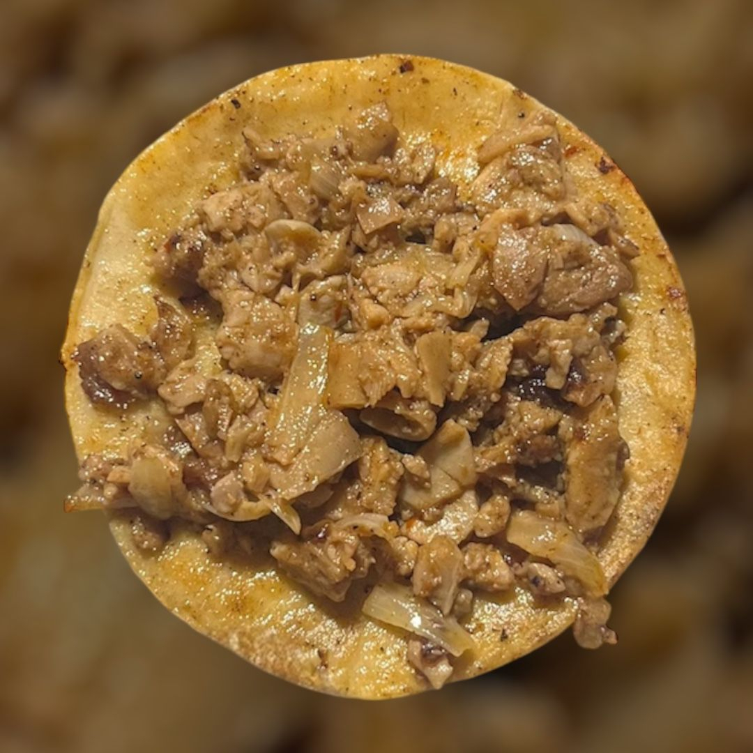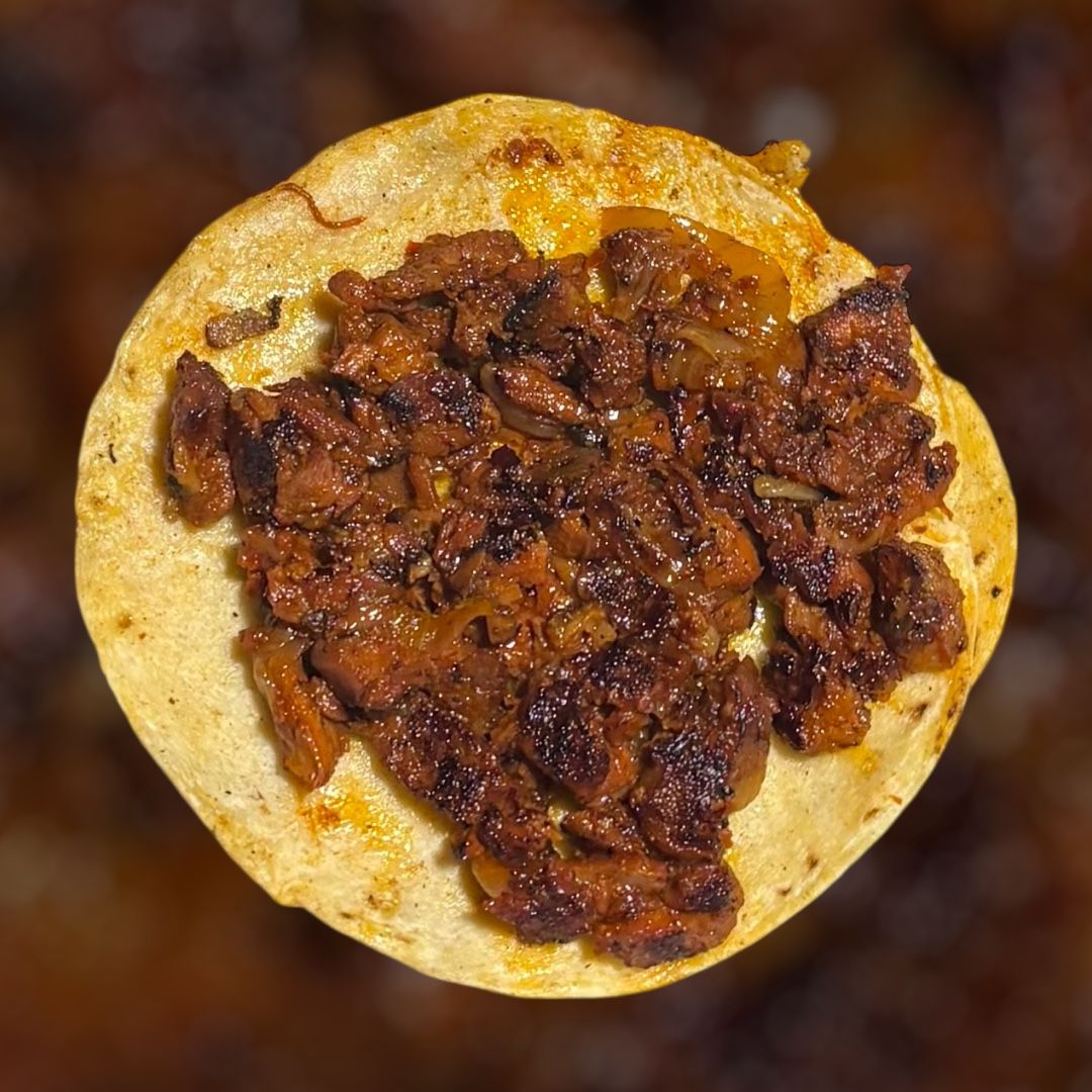 Taco de tortilla de maíz, carne de cerdo picada y condimentada con cebolla cocida, revuelta con queso manchego