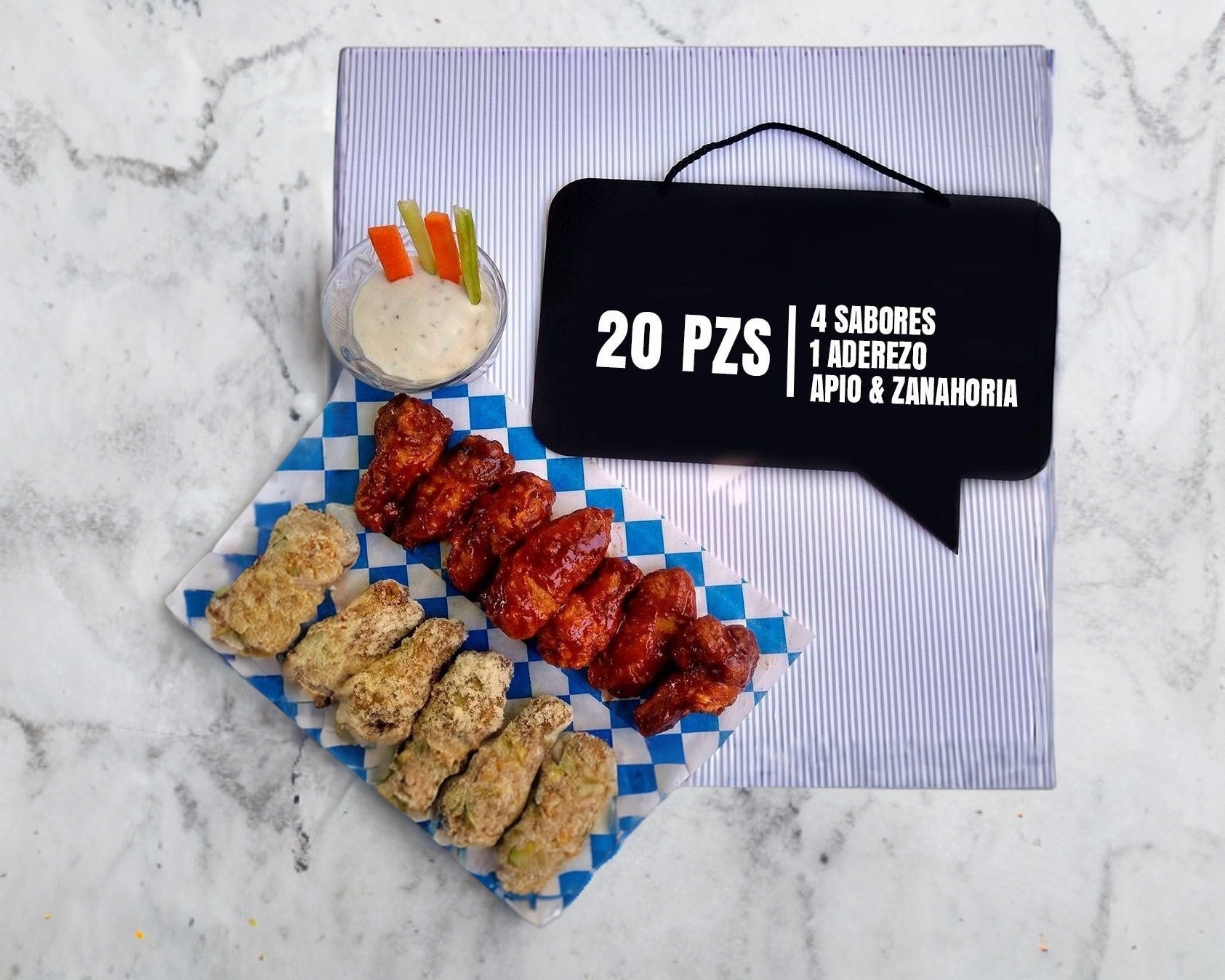 Paquete de 20 alitas hasta 4 sabores a elegir acompañado de bastones de apio, zanahoria y aderezo ranch.