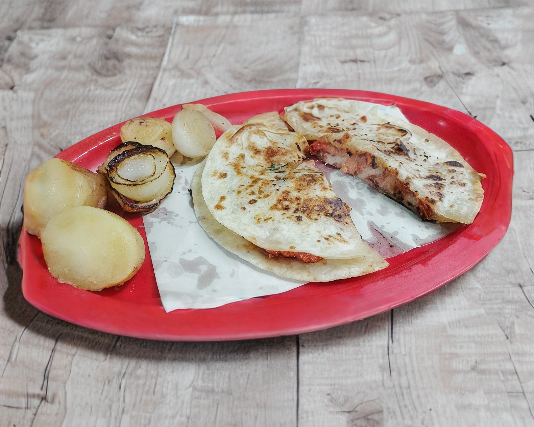 Tortilla de harina con carne asada de cerdo y queso mozzarella.