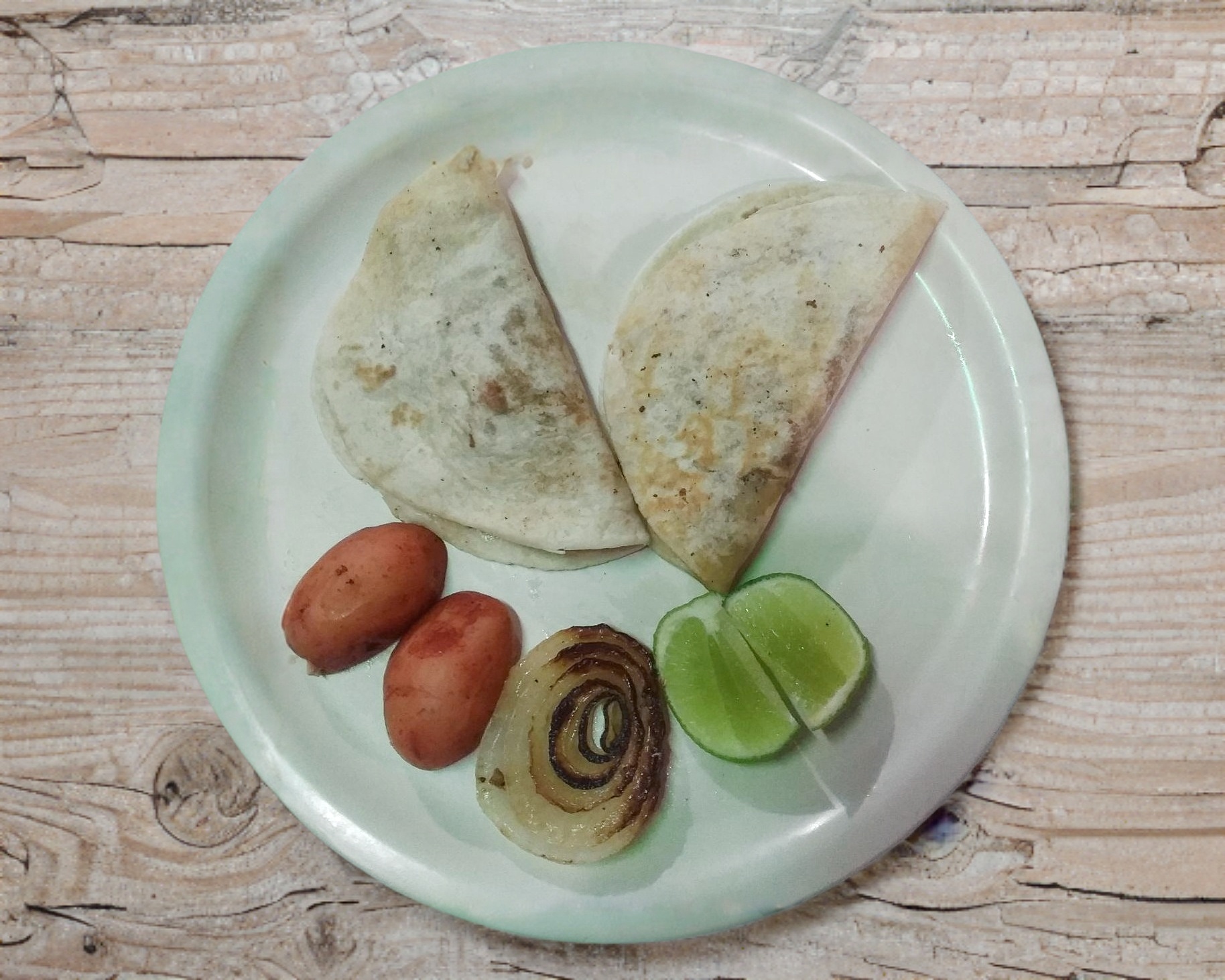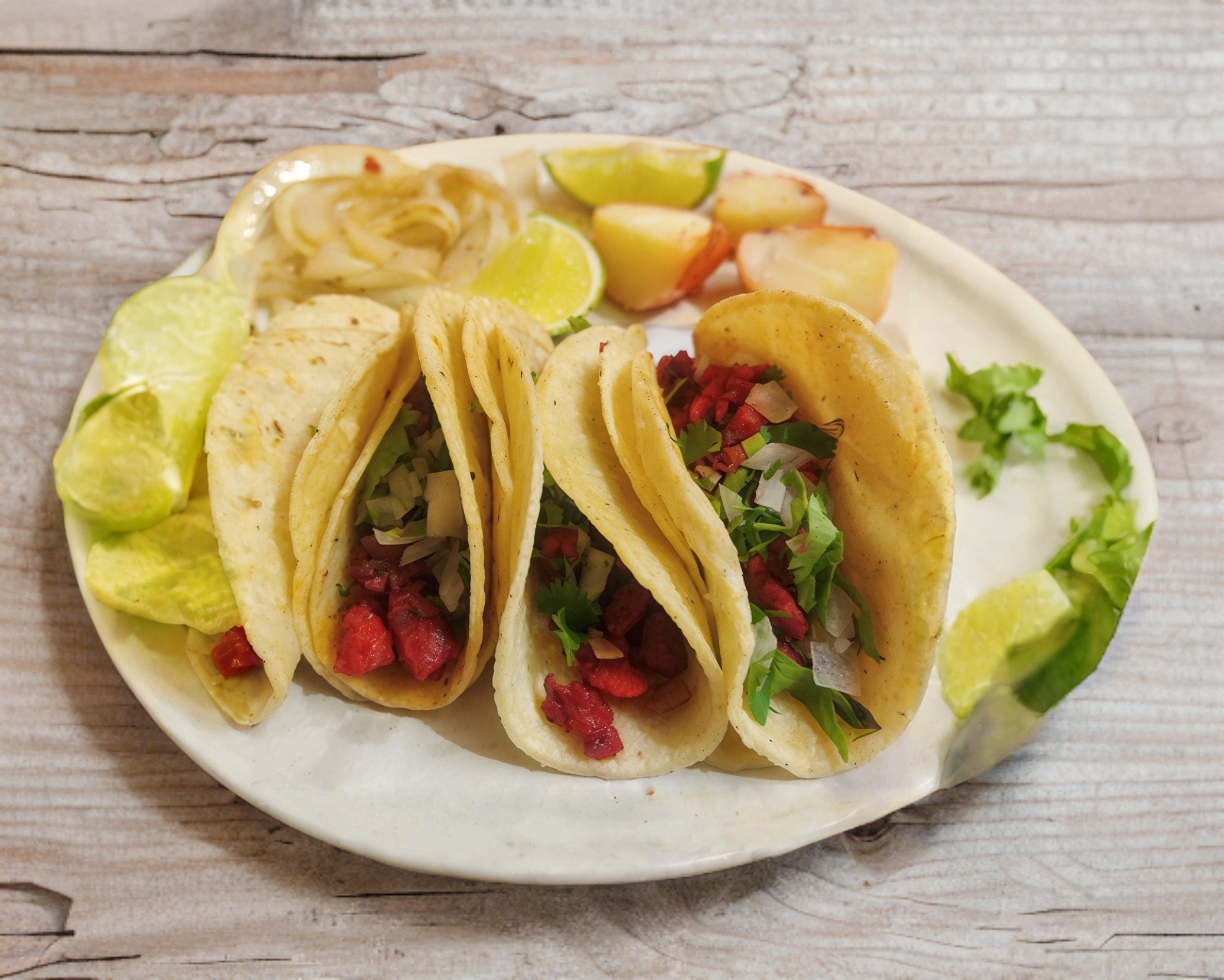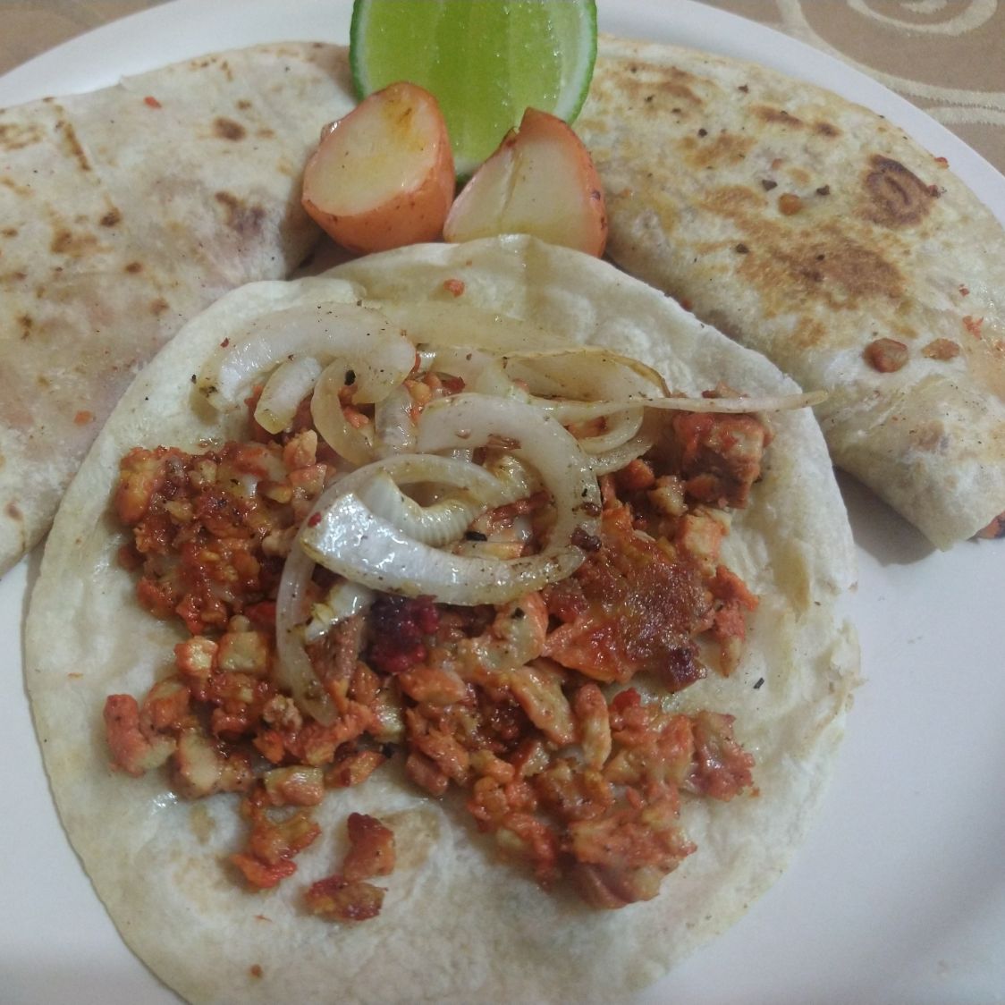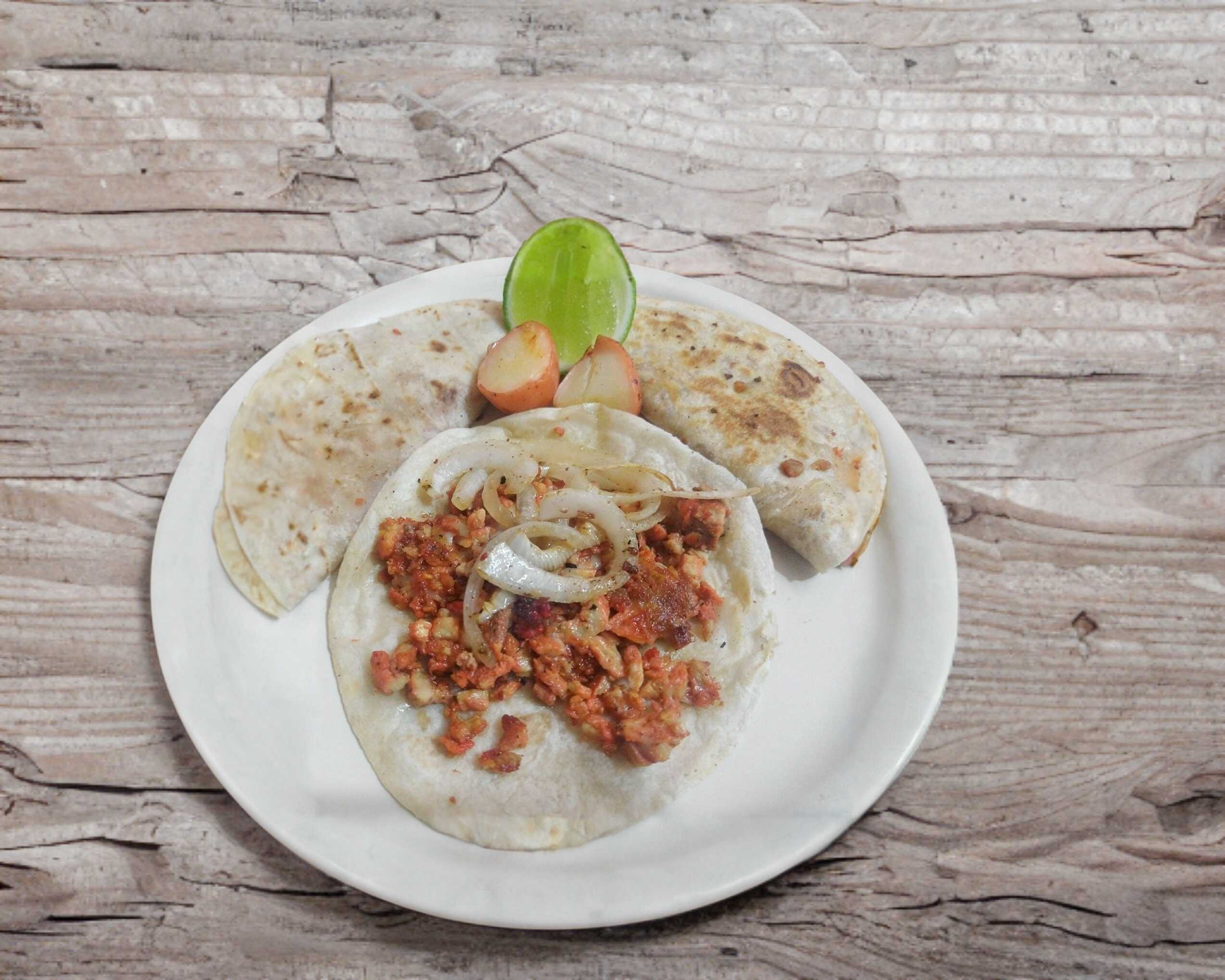 Tortilla de harina, carne de pastor, queso, salsas, papas y limón.