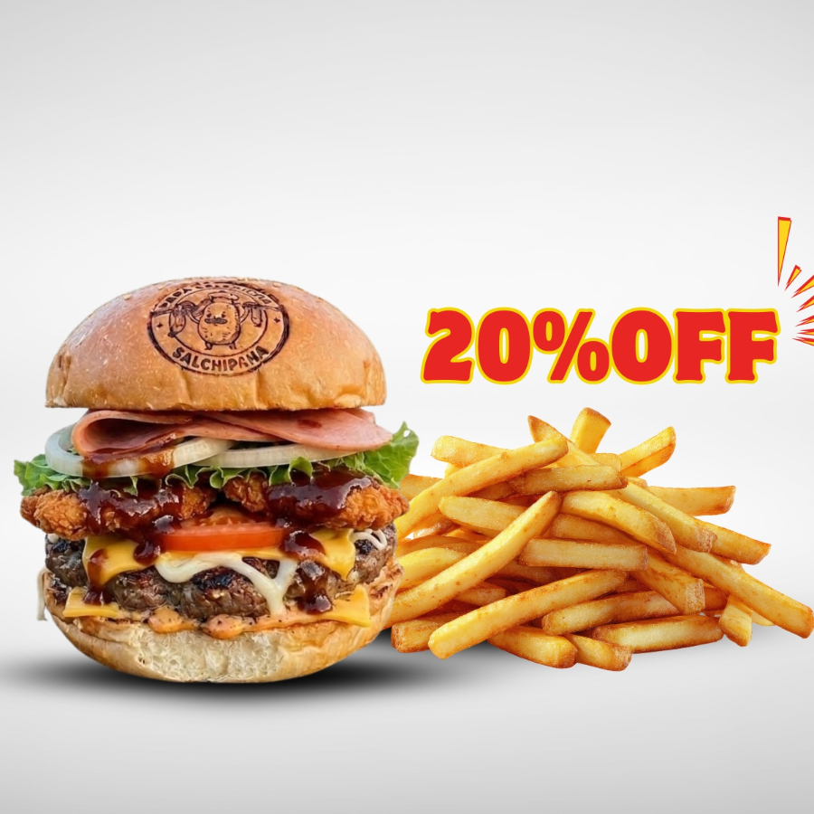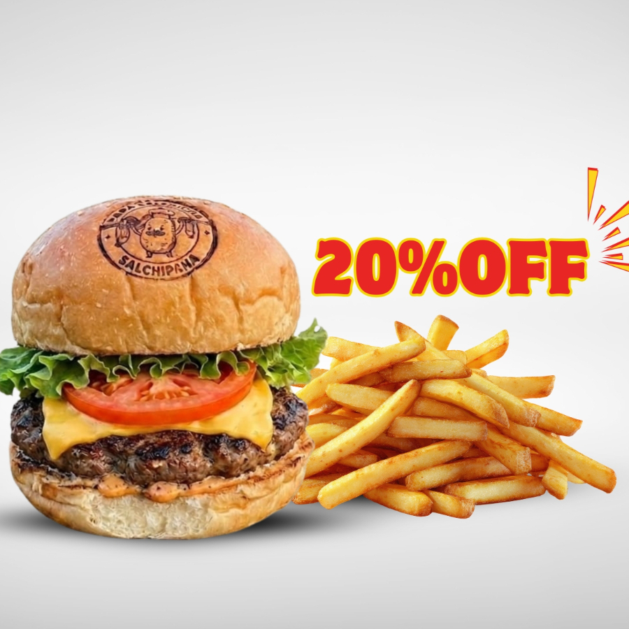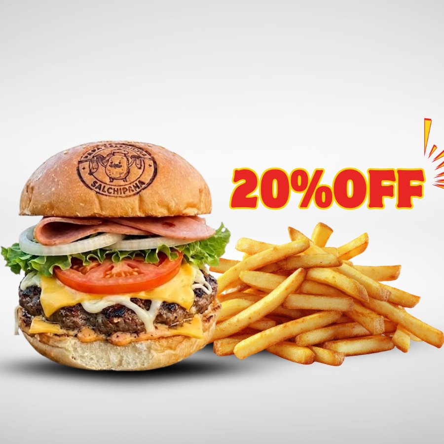 Pan artesanal, carne de sirloin, queso amarillo, tomate, lechuga, cebolla caramelizada y porción de papas a la francesa.