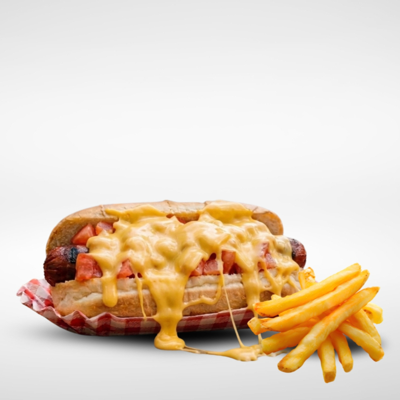 Pan, salchicha crocante, chorizo, queso americano, queso de hebra, tomate, cebolla caramelizada, mayonesa, catsup, mostaza y porcion de papas.