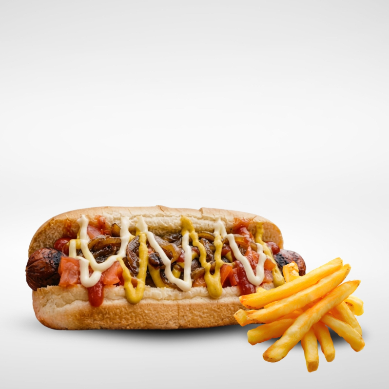 Pan, salchicha crocante, tomate, cebolla caramelizada, mayonesa, cátsup, mostaza y porción de papas.