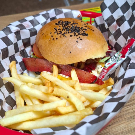 carne de sirlon 300g, queso chedar, tocino, lechiga, tomate, cebolla caramelizada y papas