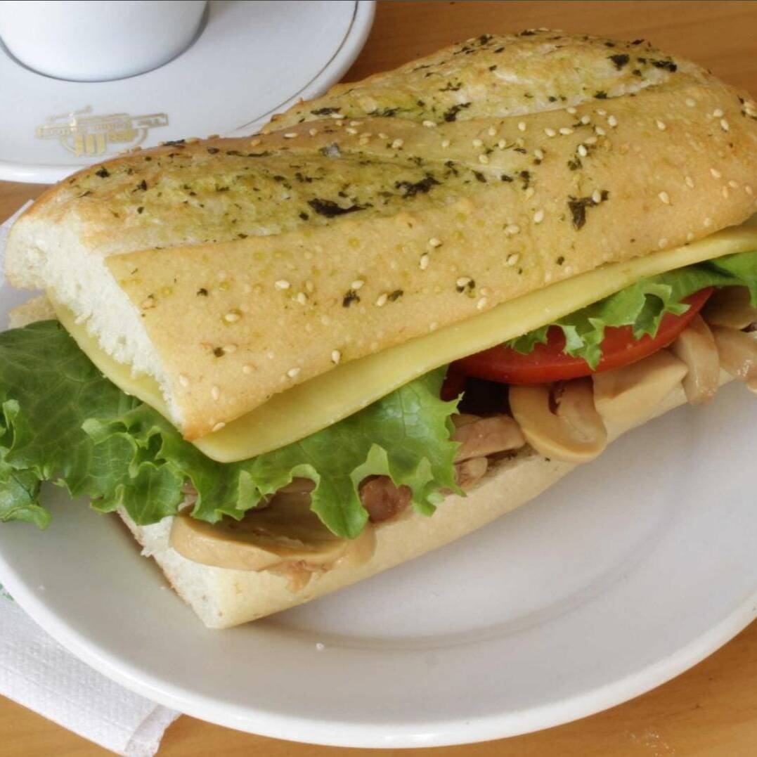 Champiñones, queso gouda, lechuga, jitomate y aderezos de la casa.