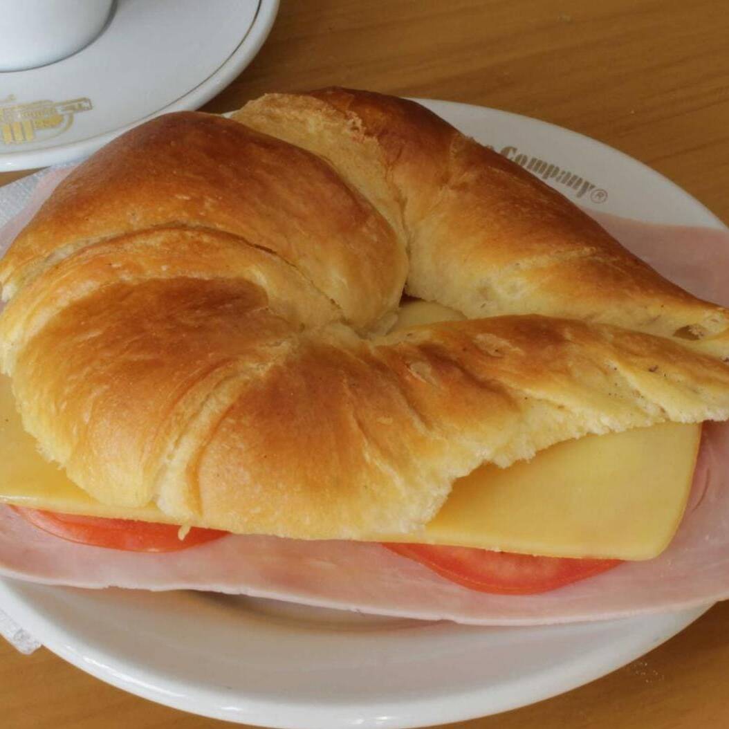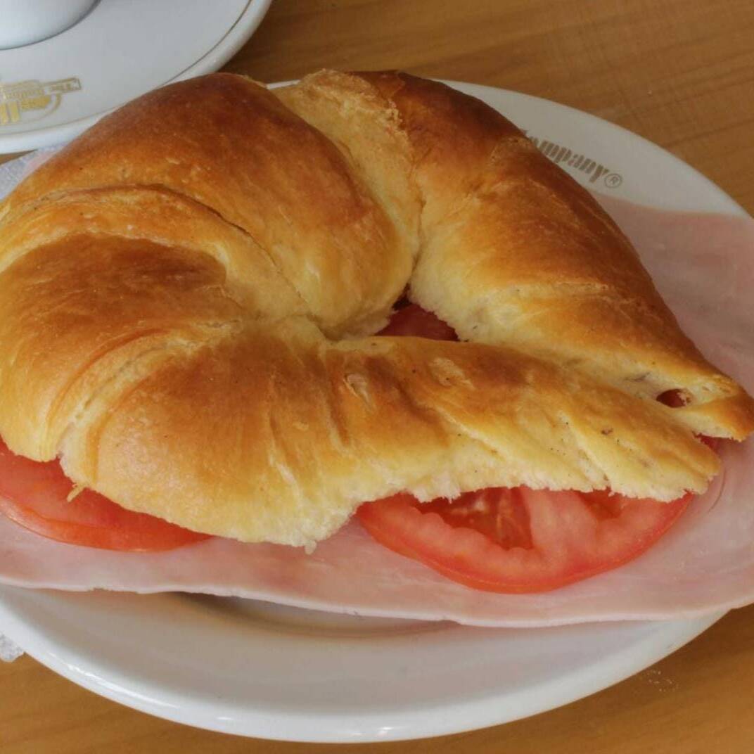 Cuernito con jamón de pierna, jitomate y aderezos de la casa.