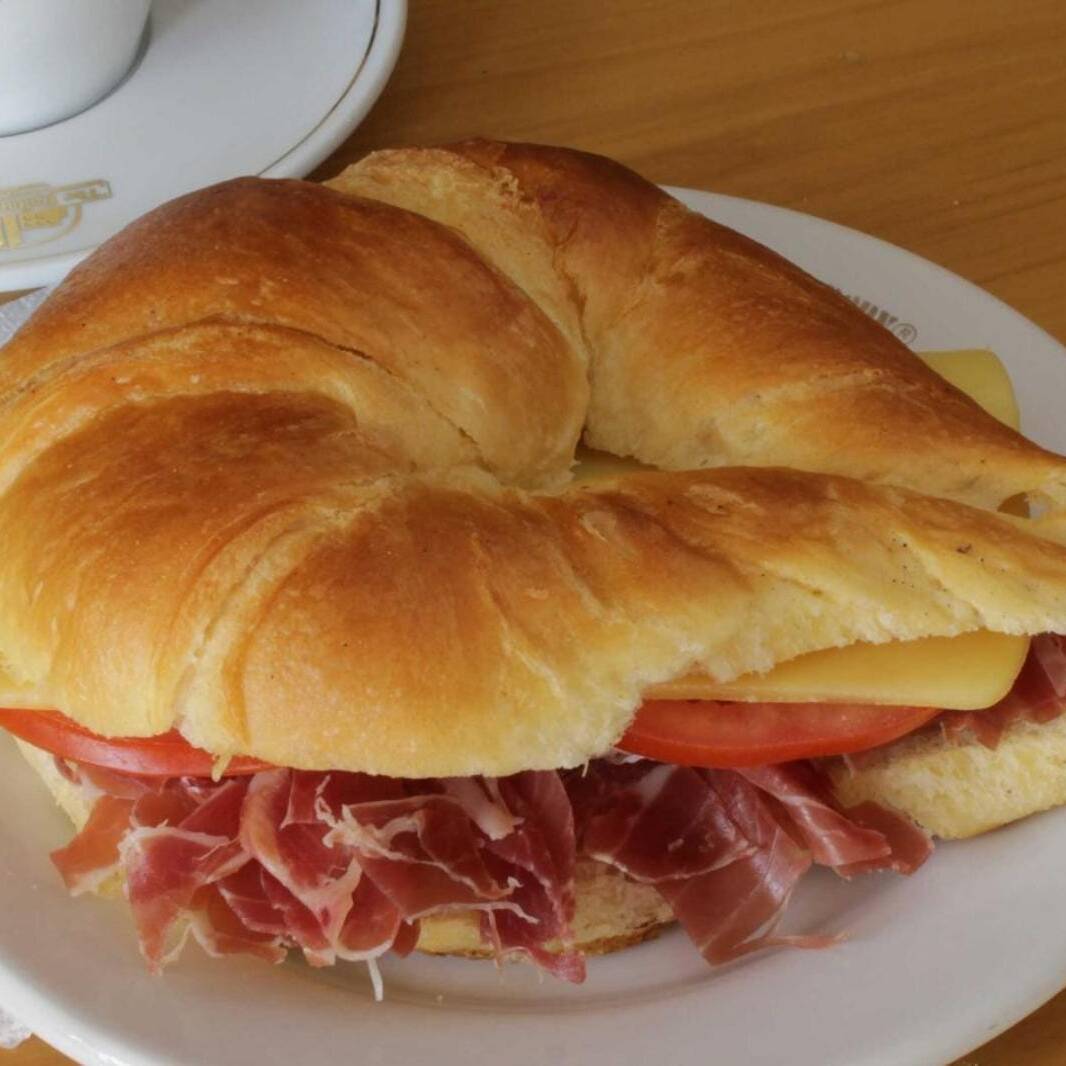 Cuernito con jamón serrano, queso gouda, jitomate y aderezos de la casa.