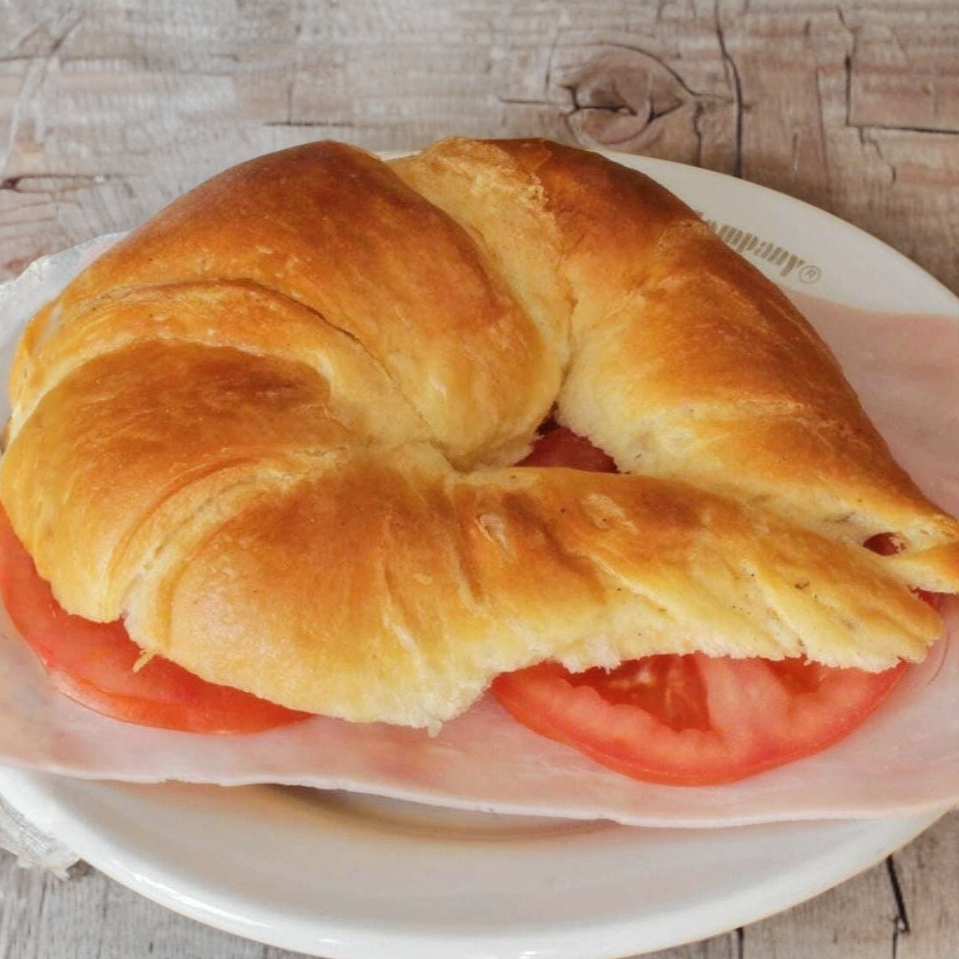 Cuernito con jamón de pierna, jitomate y aderezos de la casa.