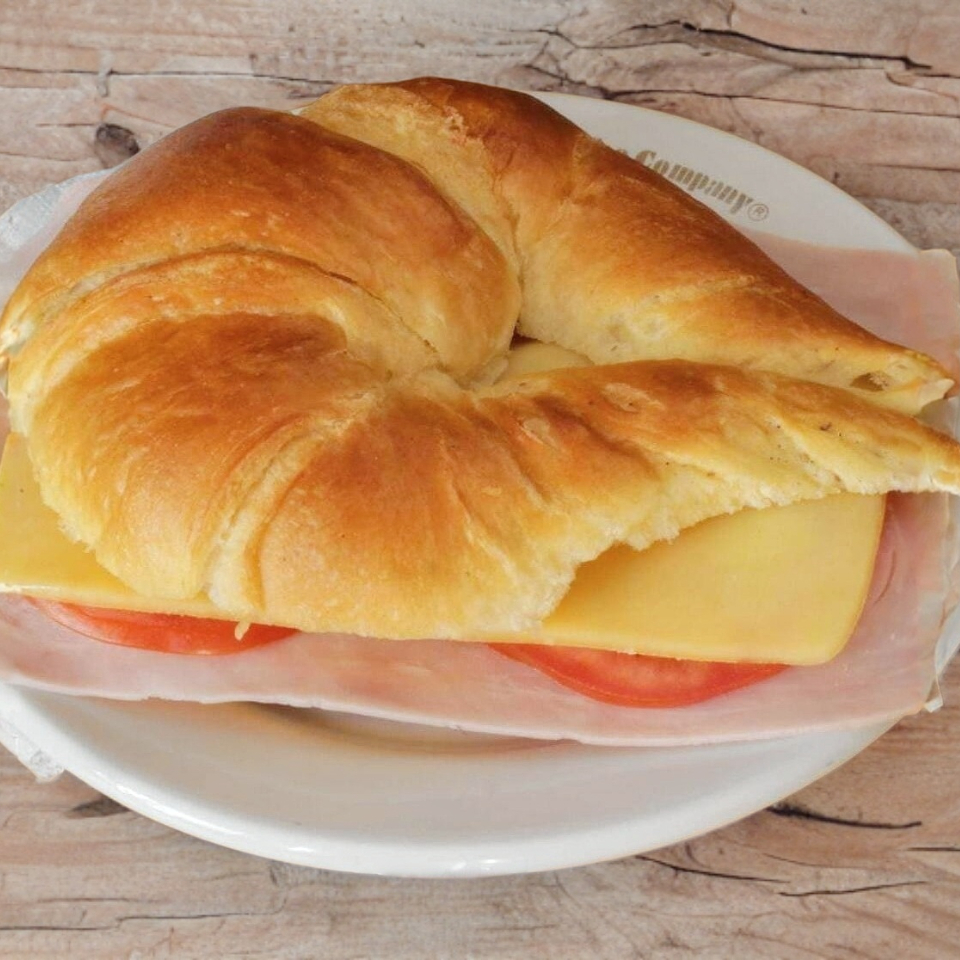 Cuernito con jamón de pierna, queso gouda, jitomate y aderezos de la casa.