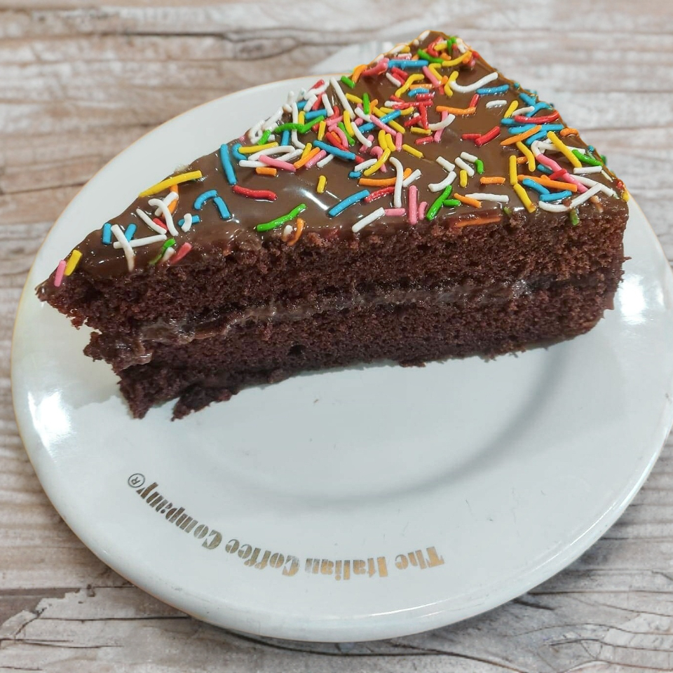 Pan de chocolate, cubierto y relleno de rico y cremoso chocolate, decorado con granillo de colores.