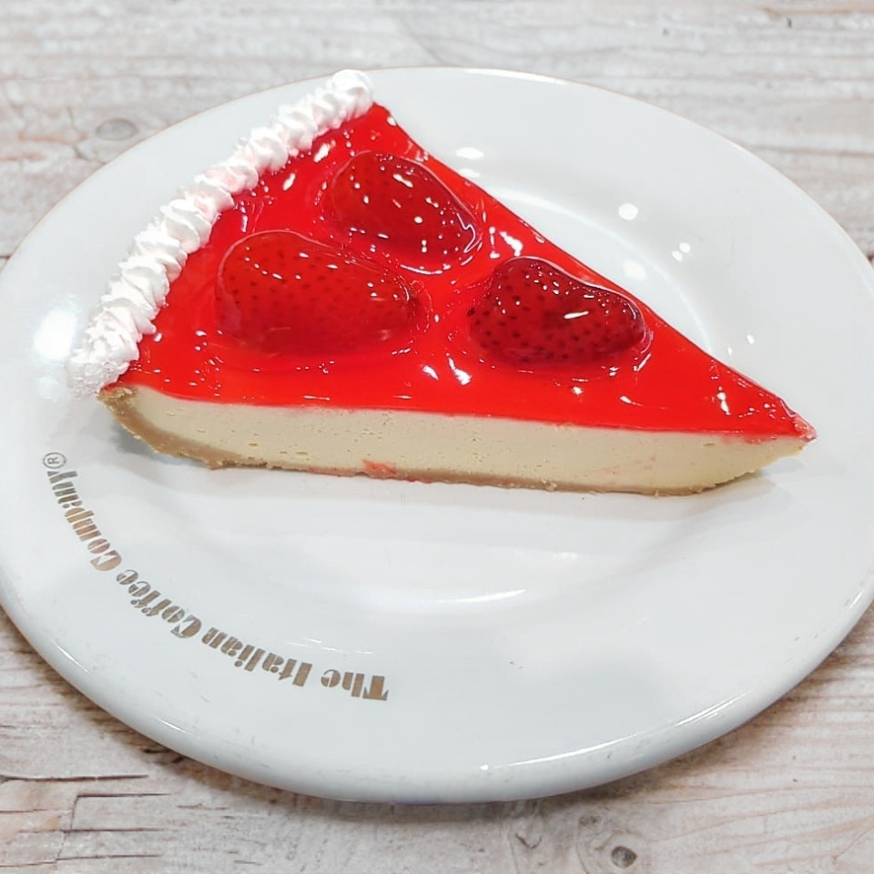 Base de galleta y queso con mermelada de fresa, acompañado de fresas naturales.