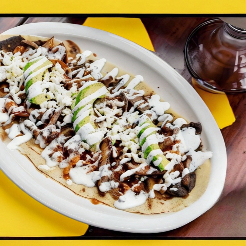 Acomapañada de guacamole, 2 garnachitas de mole, frijoles y pimientos salteados con cebolla.