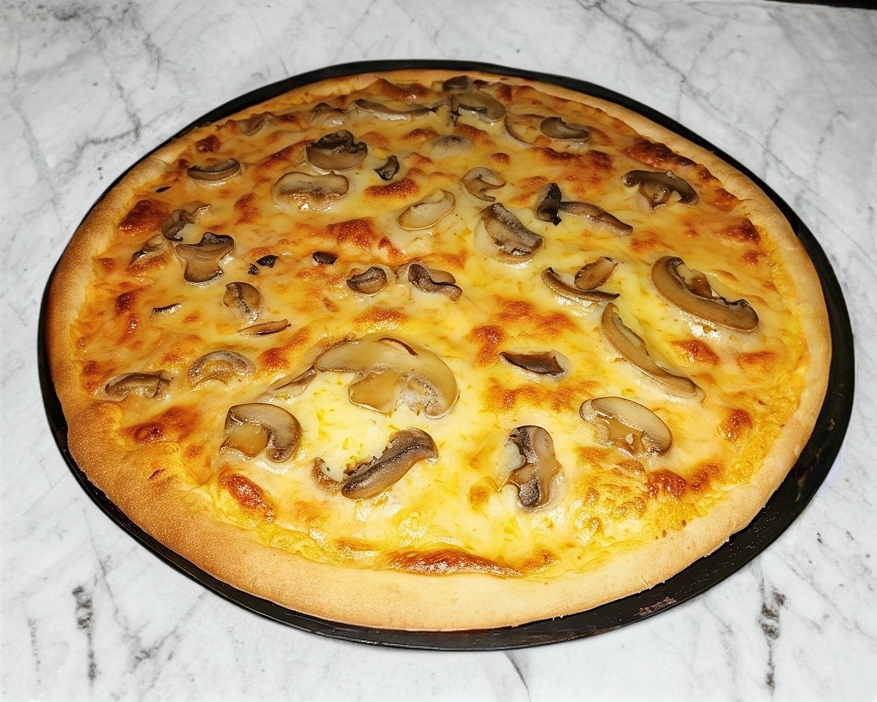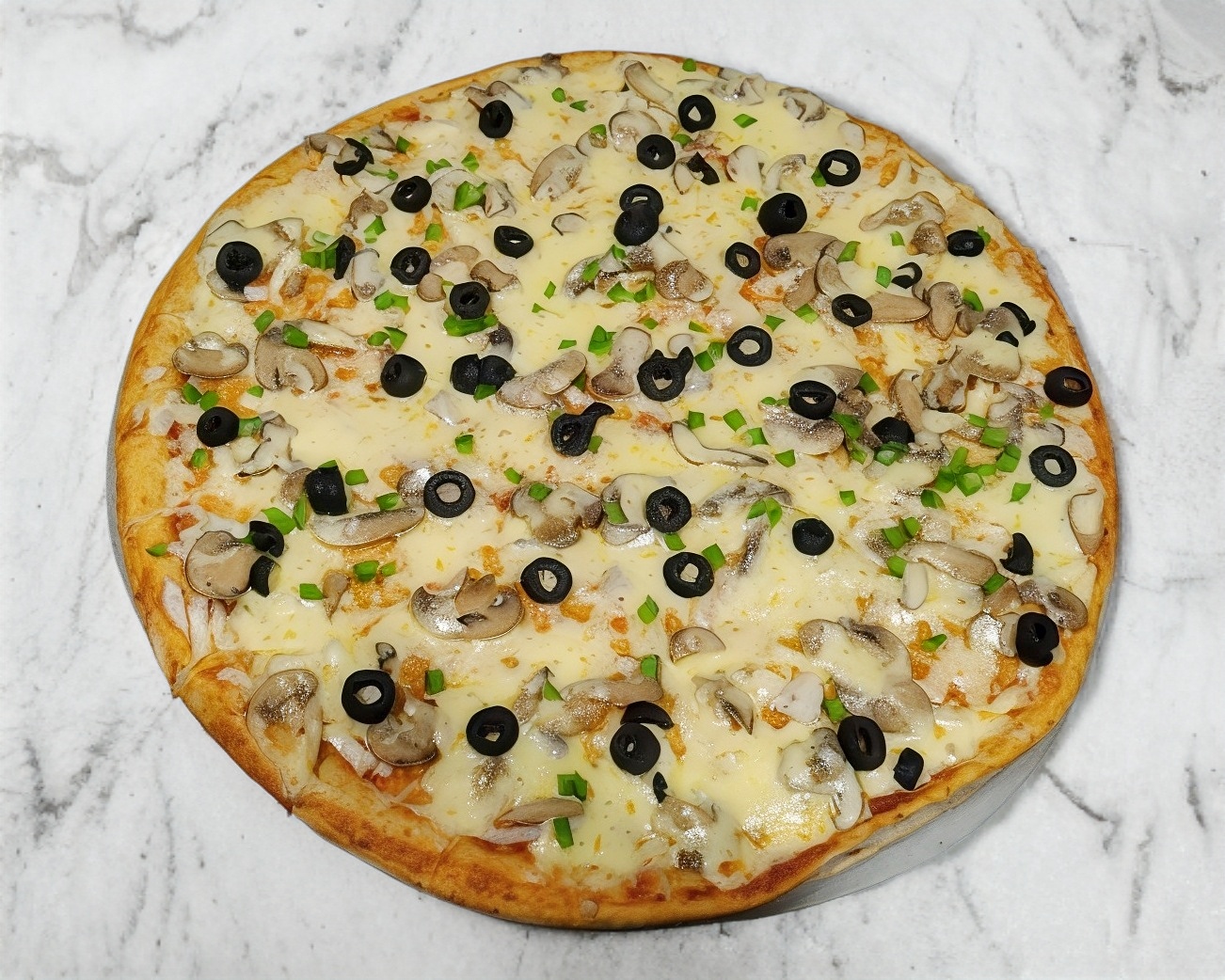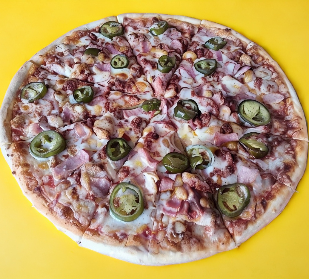 Pepperoni, pollo, cebolla, pimiento, aceitunas y champiñón.