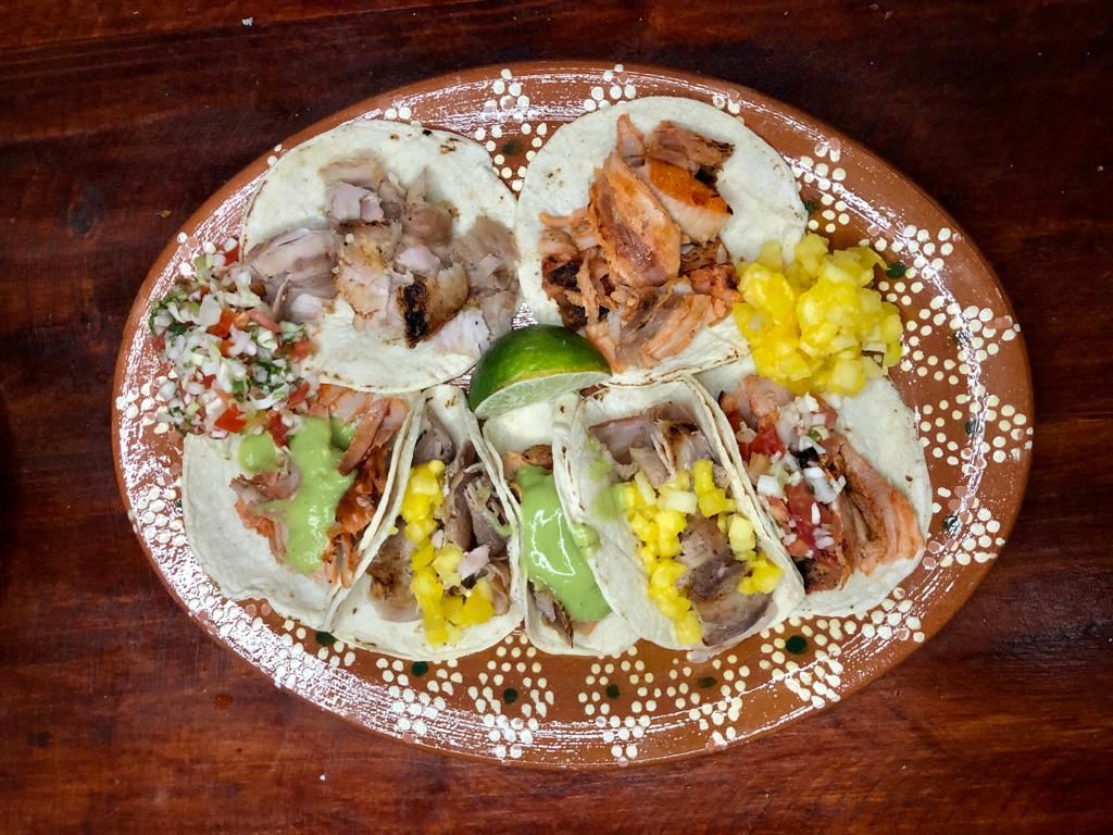 Incluye tortillas, salsa mexicana, guacamole, limón, piña, cebolla y cilantro.