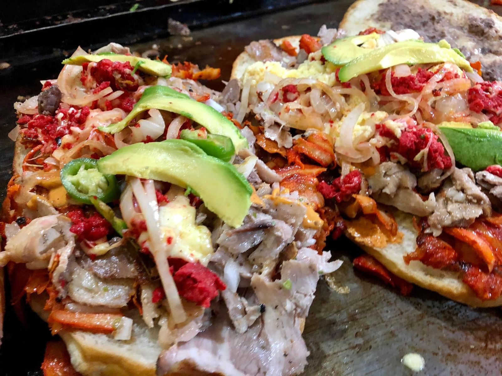 Longaniza, cebolla, chile asado, aguacate, carne, queso, aderezo y mayonesa.