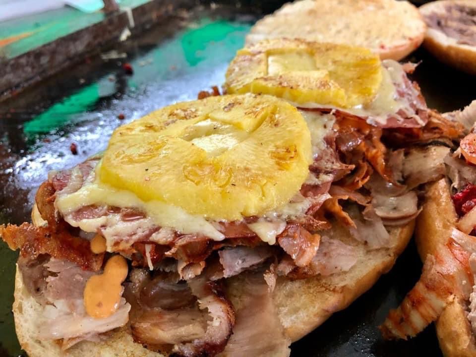 Piña y jamón asado, aguacate, carne, queso, aderezo y mayonesa