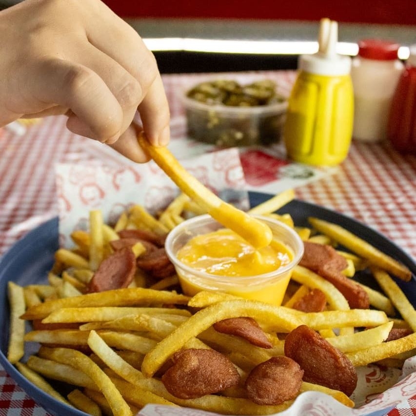 Orden de 350 g de papas con salchicha.