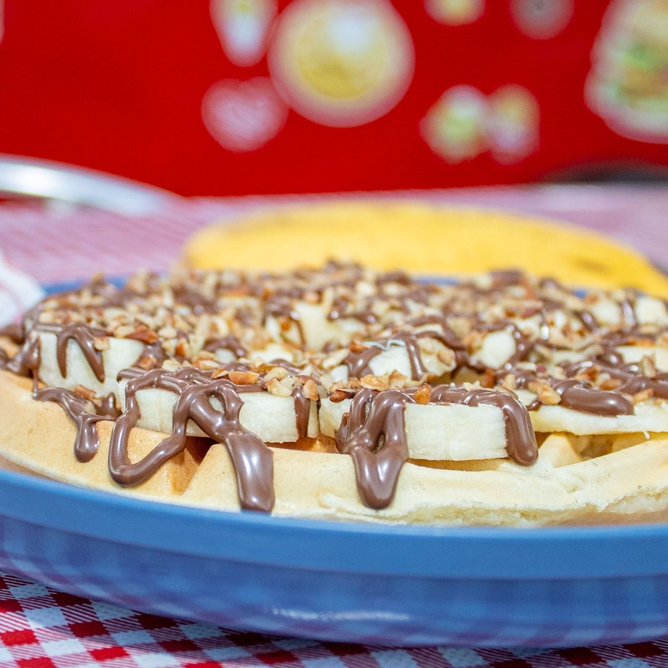 1 Waffle redondo de dos ingredientes elegidos de la lista.