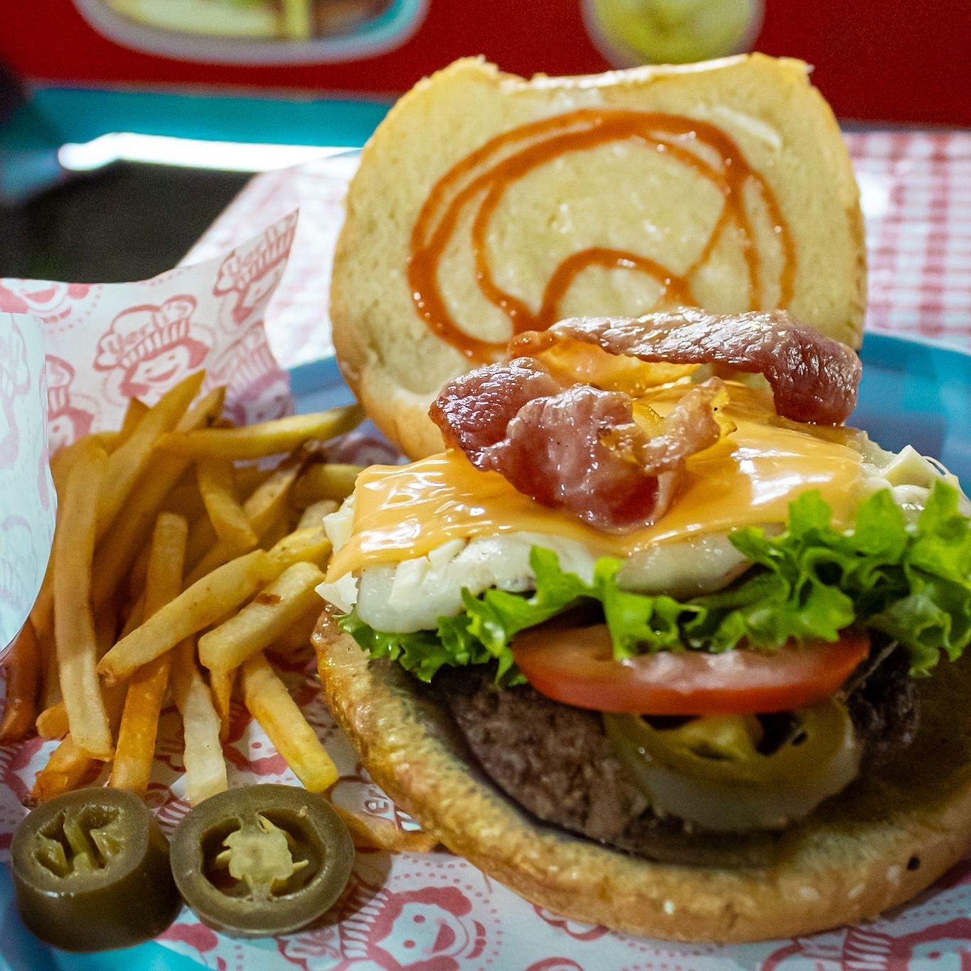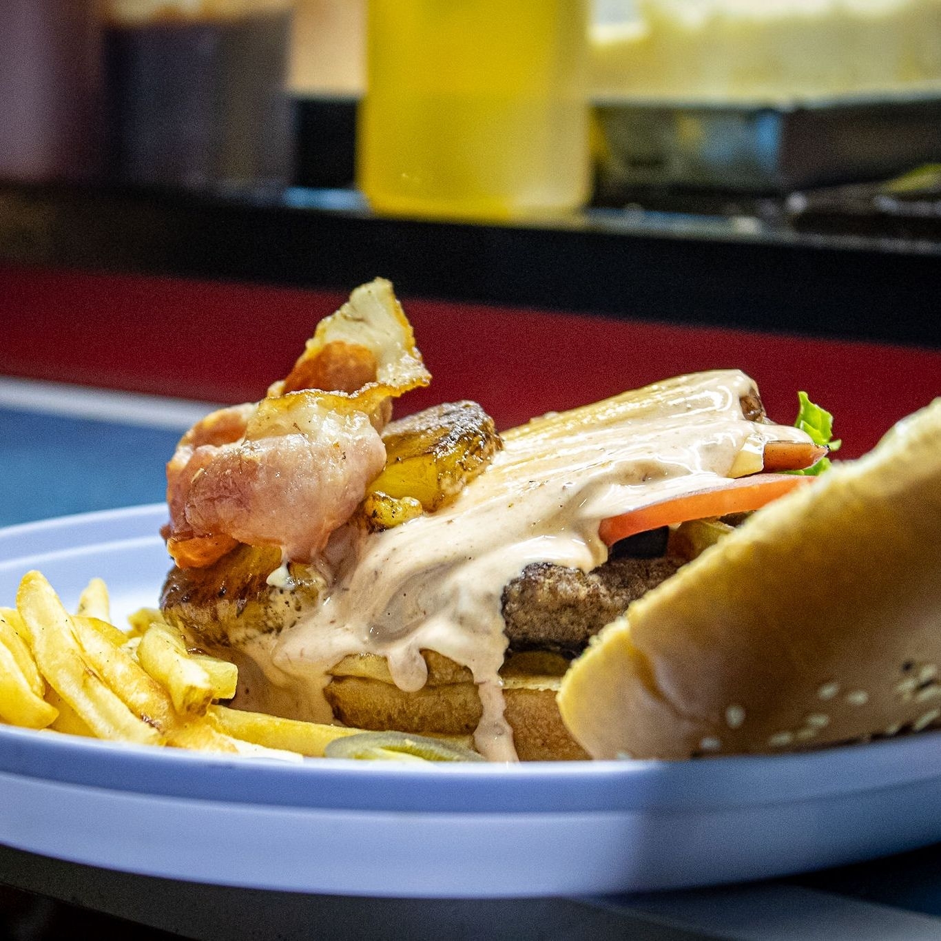 Pan jumbo, carne de res casera, salchicha, jamón, queso americano, aderezo chipotle, tocino, piña, mayonesa, cátsup, lechuga y tomate.