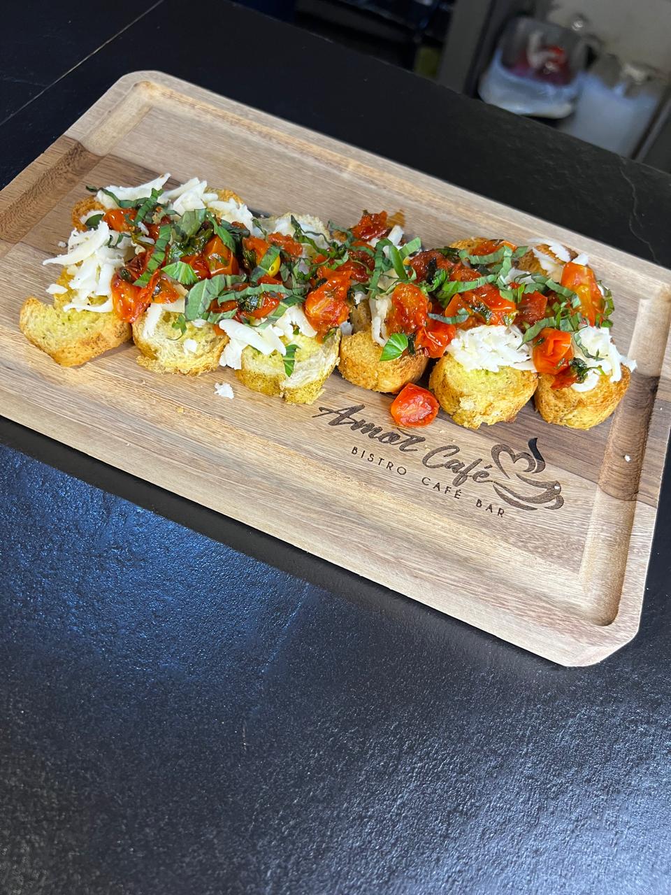 mantequilla, de hierbas, jitomate salteado, queso mozarella fresco, terminados con aceirte de oliva, y albahaca fresca