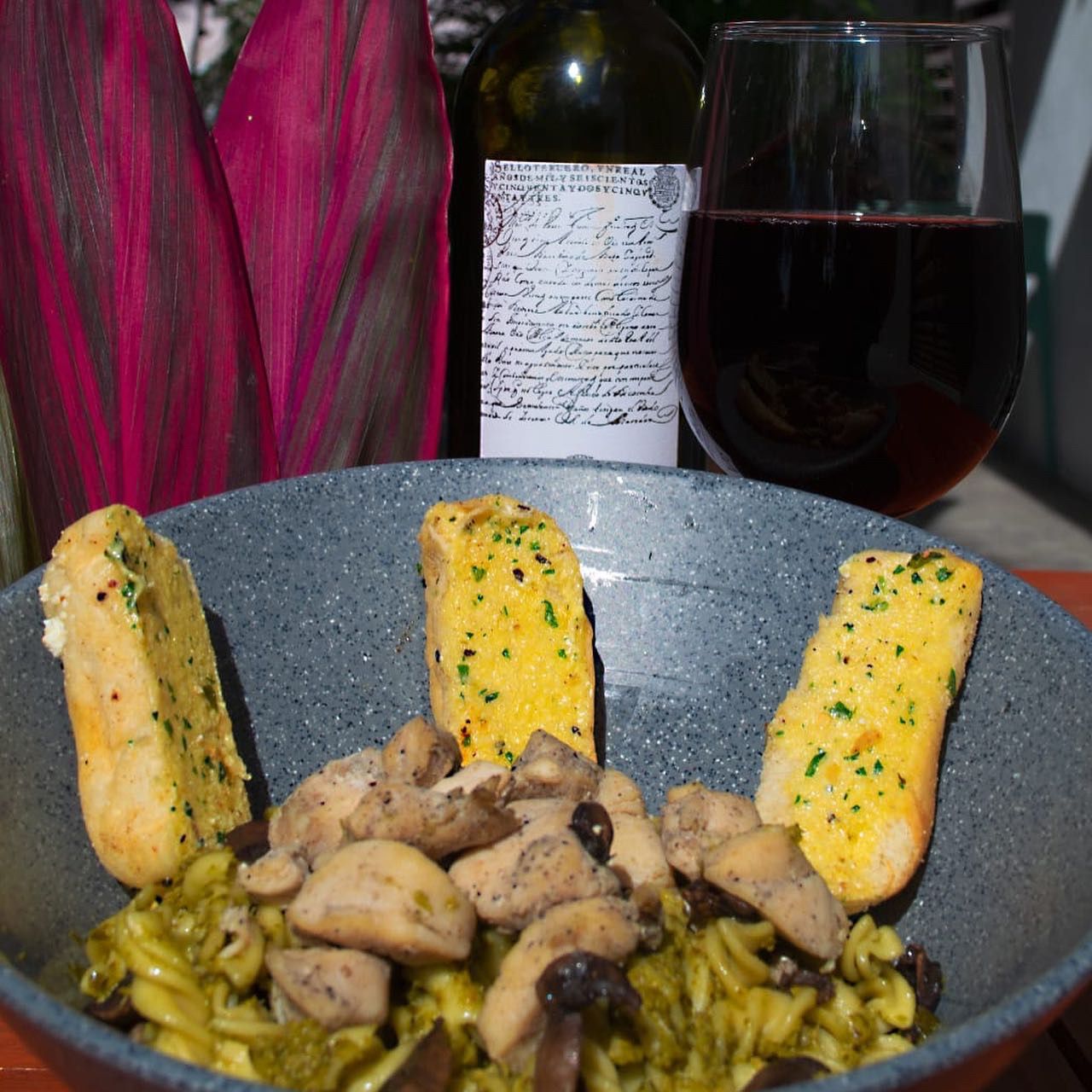Fusilli mezclado con salsa pesto, trozos de pollo, champiñones, parmesano, acompañado de pan bagette