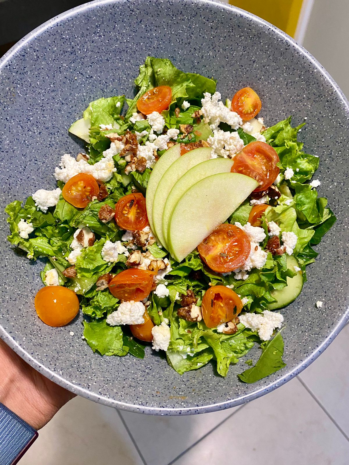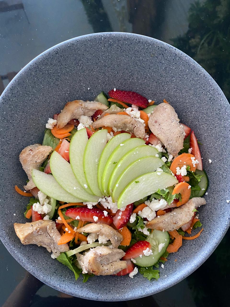 Rica ensalada con lechuga, pepino, zanahoria acompañada de fresas, manzana, queso de cabra y almendras fileteadas