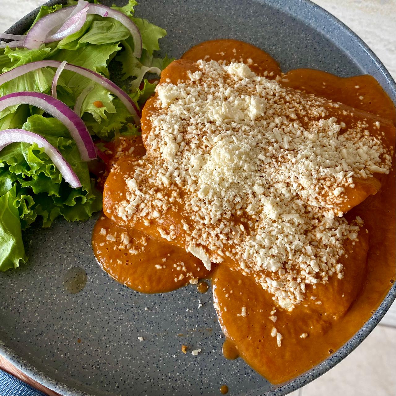 3 pzas. Rica tortilla bañada en salsa de frijol rellenos de pechuga de pollo con queso