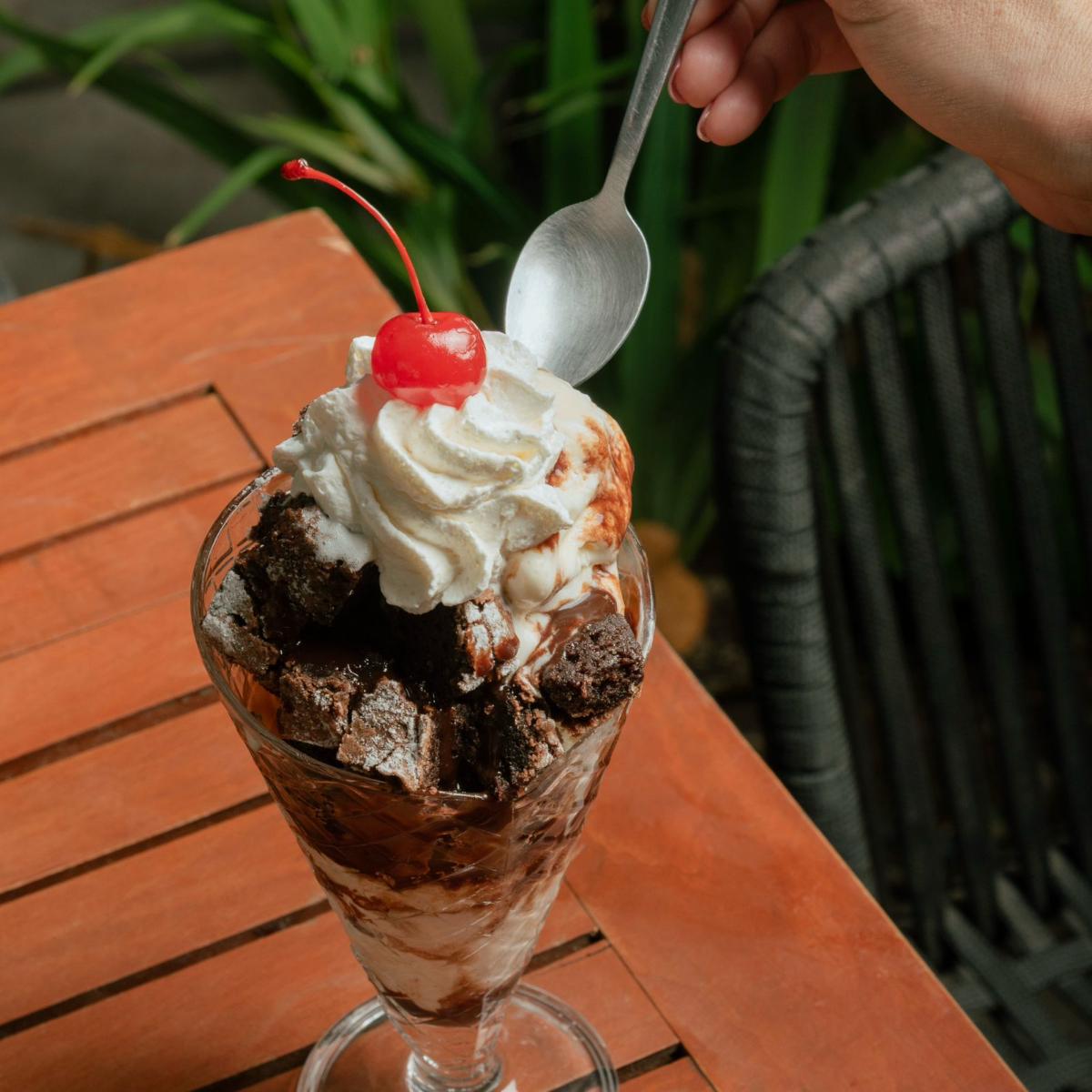 Copa de helado, con trozos de brownie y salsa de chocolate
