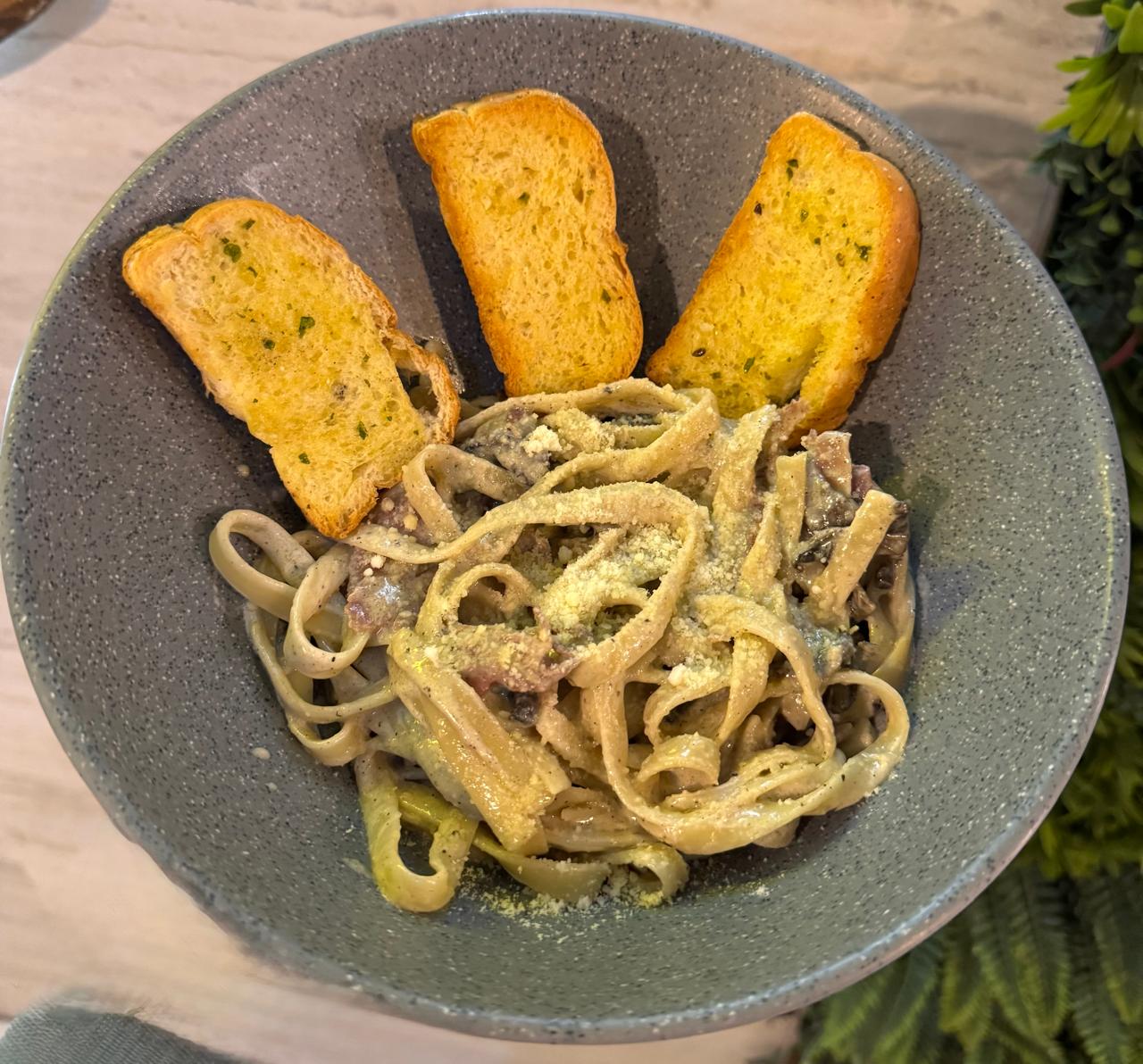 Pasta fetuchine eb salsa blanca y pimiento negro, trocilos de jamon serrano, queso parmesano, y champiñones a la mantequilla,acompañado de parmesano y pan baguette
