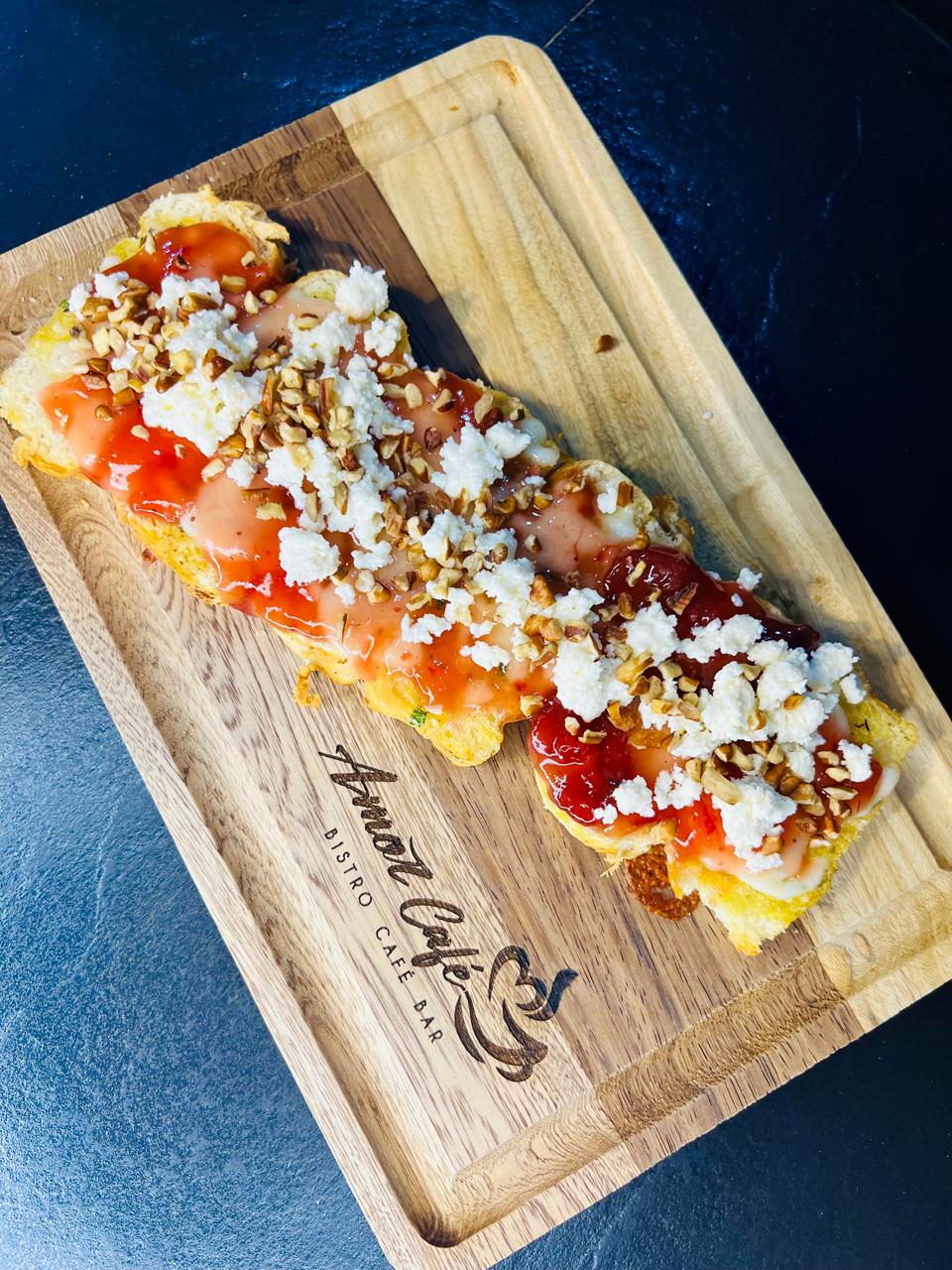Queso mozzarella, gratinado, mermelada, requeson y nuez picada