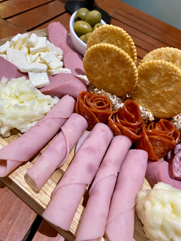 Una deliciosa tabla de quesos acompañada con carnes frias y aceitunas