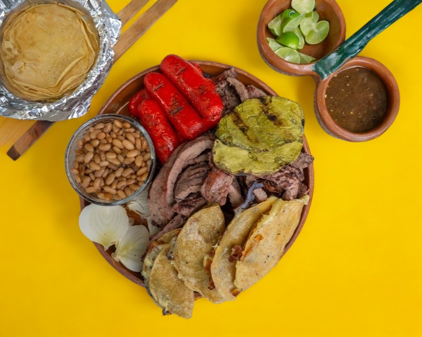 Arrachera 1 kg, 4 pz quesadillas, frijoles, salsas de la casa, 3 pz salchicha, docena tortillas y cebollitas.
