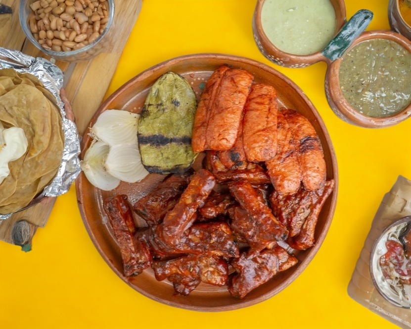 Costilla de cerdo a la bbq 1 kg, 3 pz chorizo corona, salsas de la casa, docena tortillas, frijoles, nopales y cebollitas.