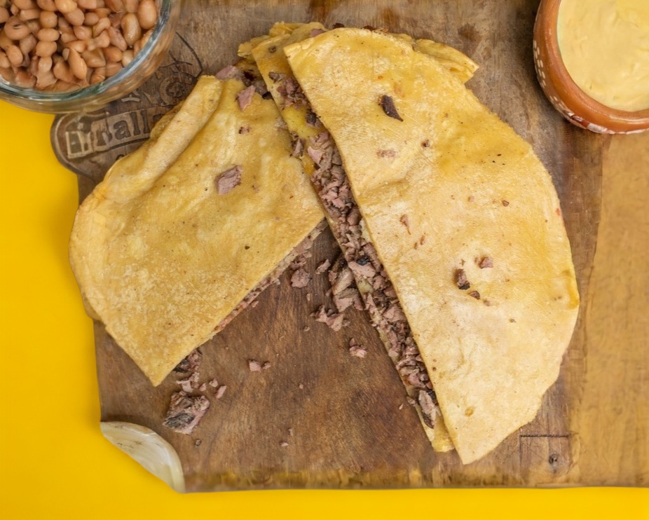 2 Tortillas de maíz 25 cm rellena de queso, carne con salsas de la casa y frijoles.
