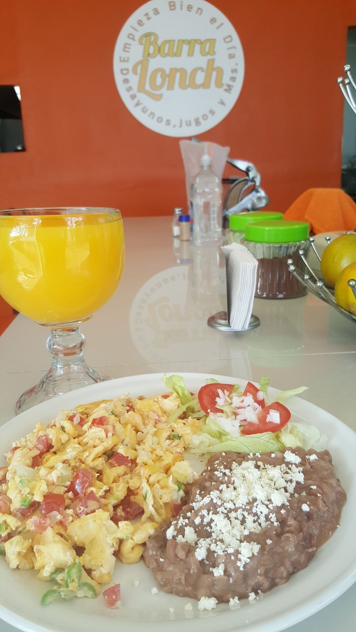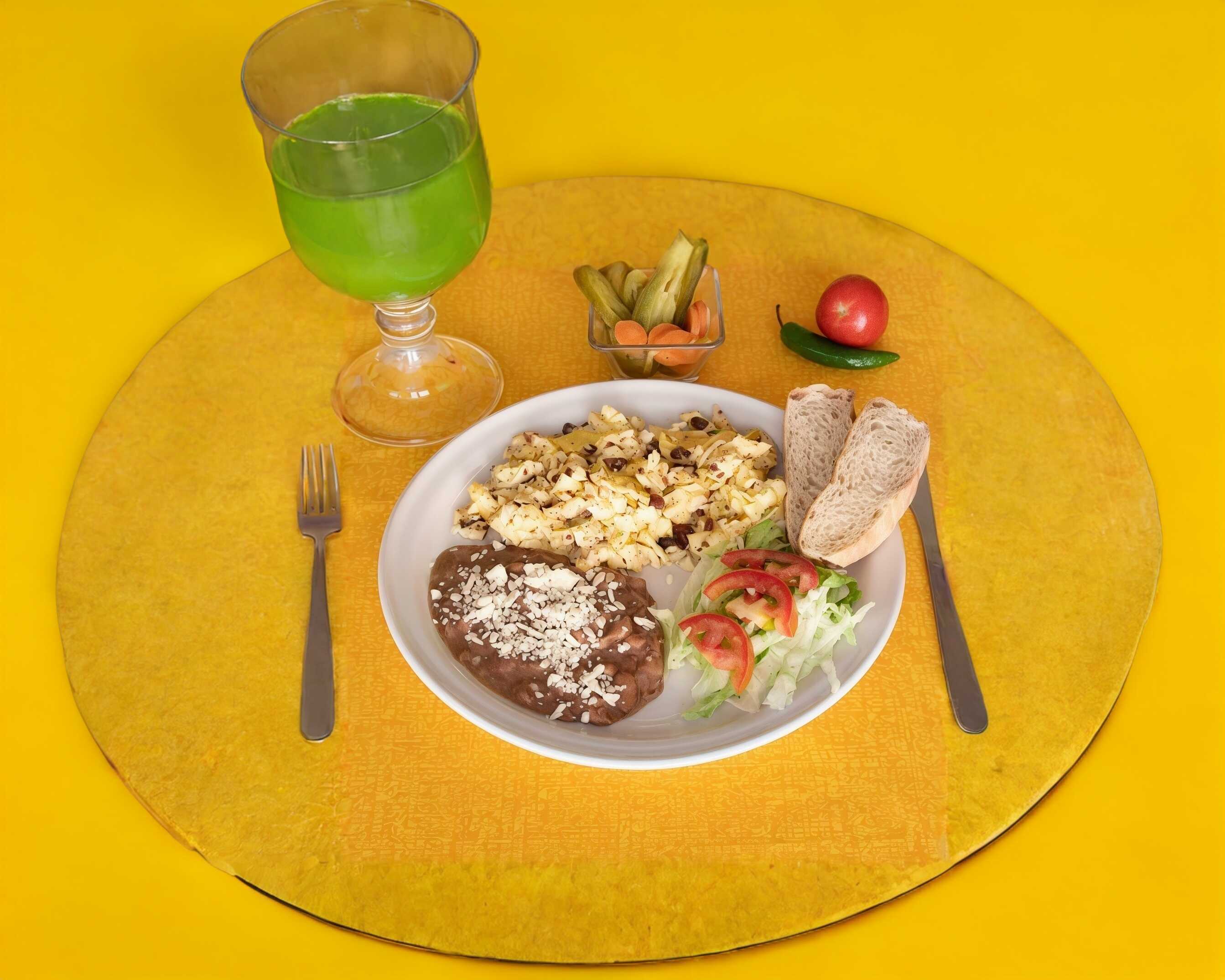 Tortilla de huevo rellena de queso asadero. acompañado de Frijoles, ensalada y pan tostado.