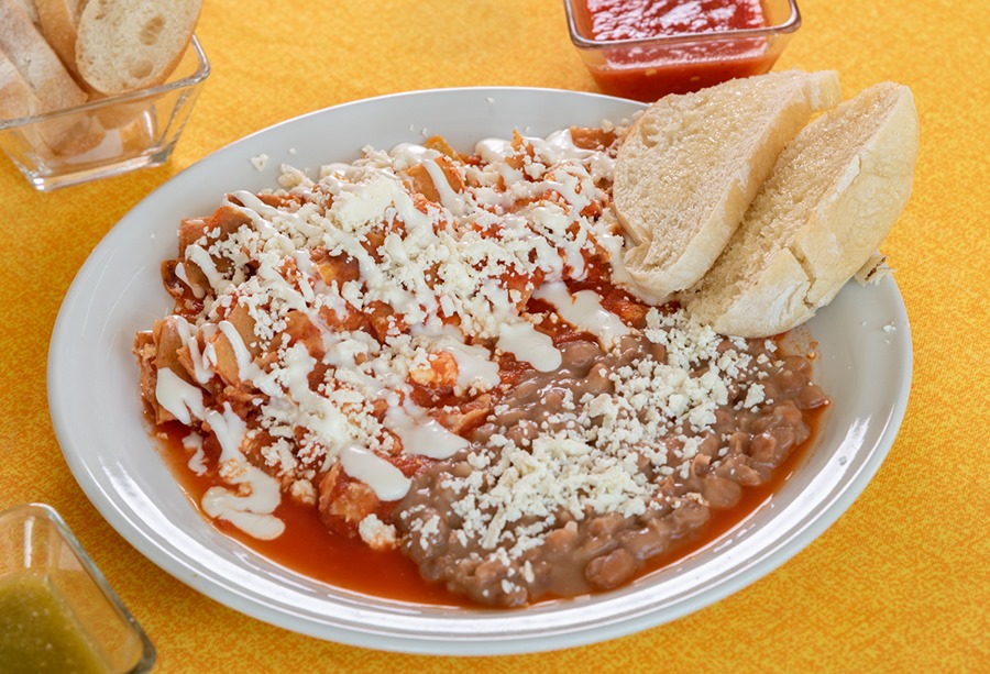 Tortilla doradita con salsa de tu preferencia. acompañados con crema, queso semi, cebolla, frijoles y pan dorado (Porción personal).