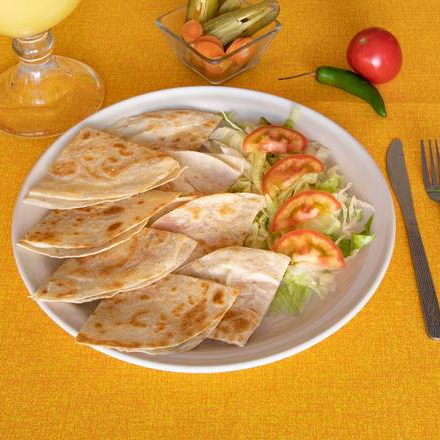 3 Piezas, tortilla de harina, frijoles, queso asadero y proteína a elegir.