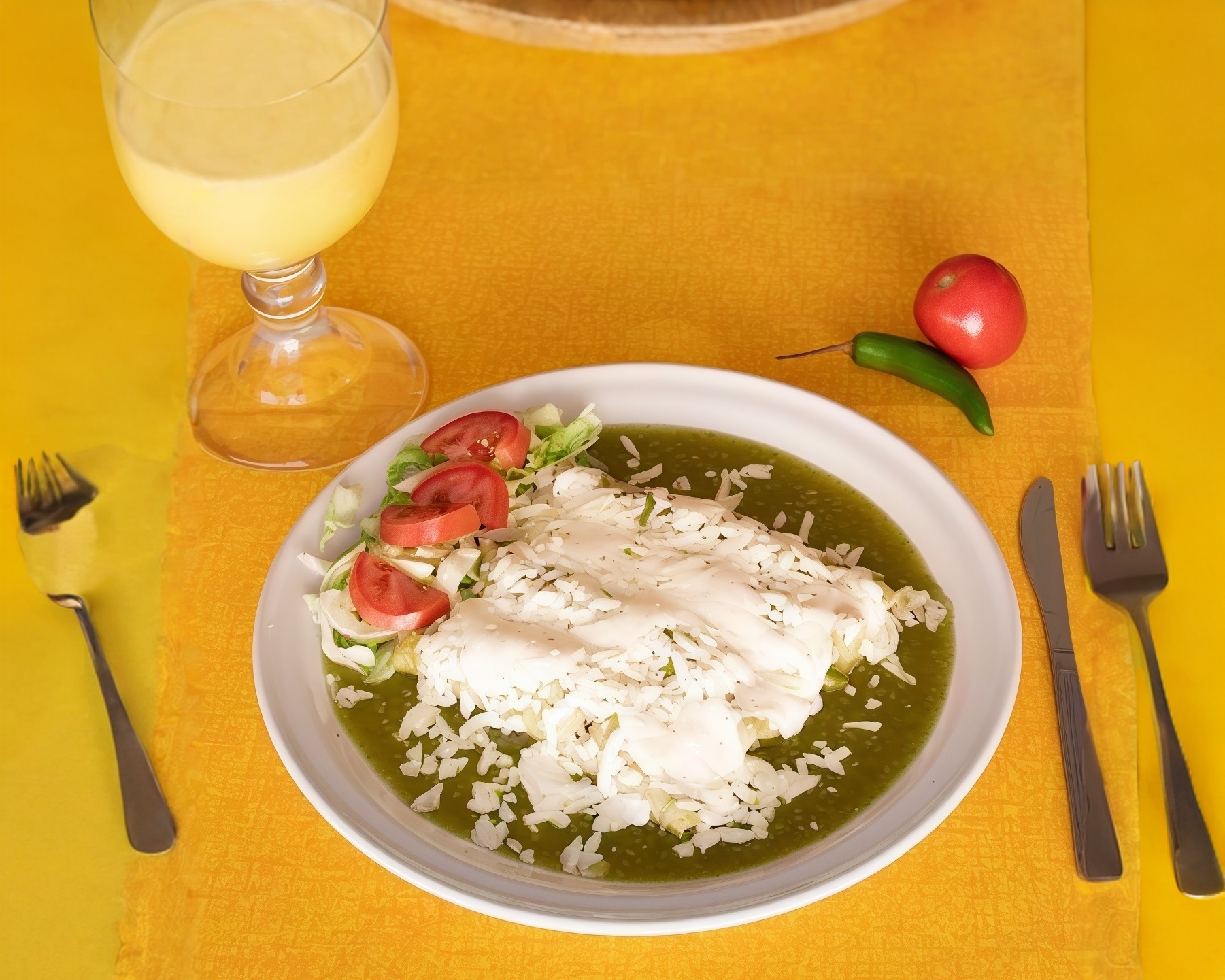 Tortilla de maiz relllena de pollo bañados en salsa verde y Gratinados.